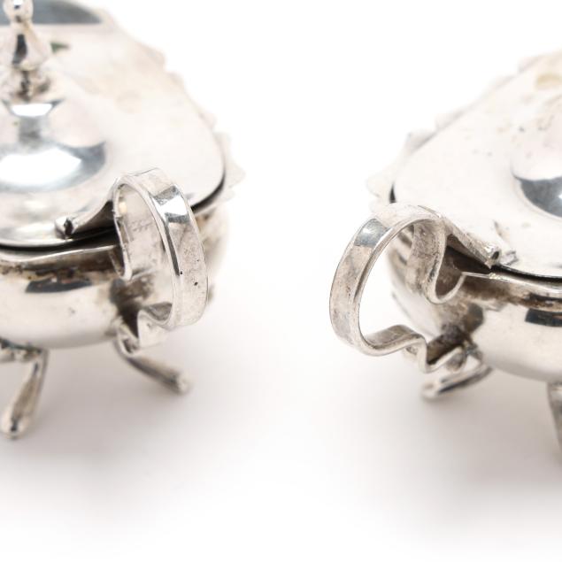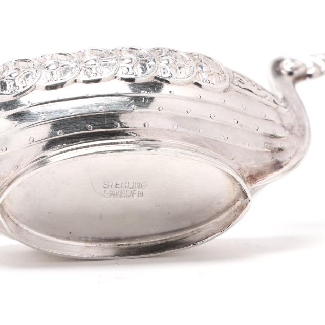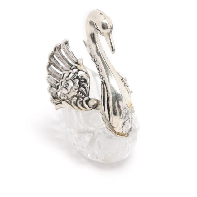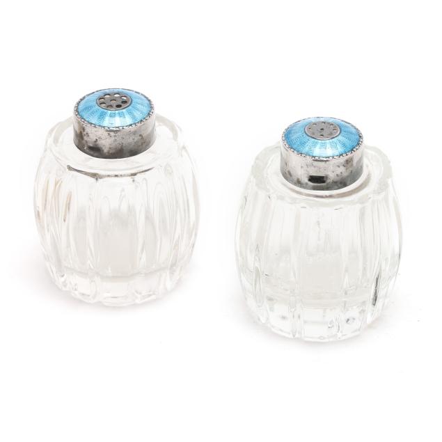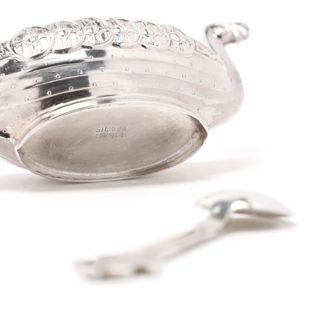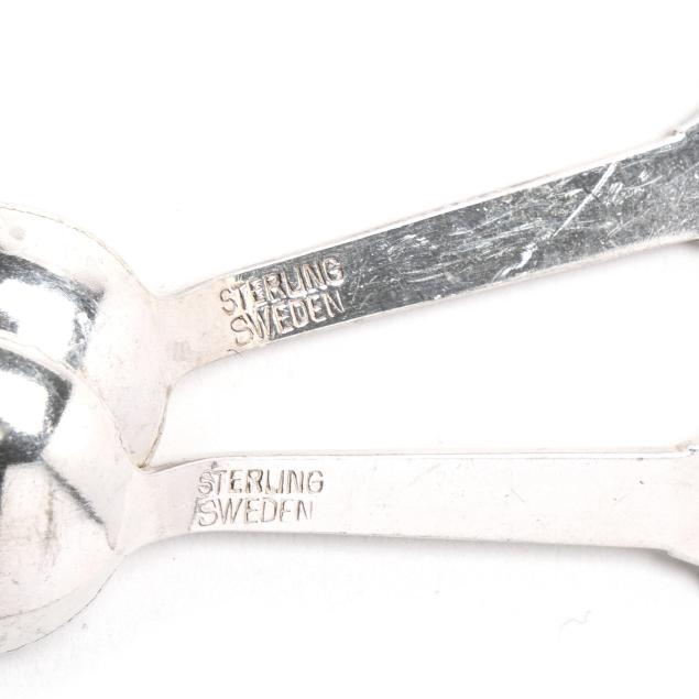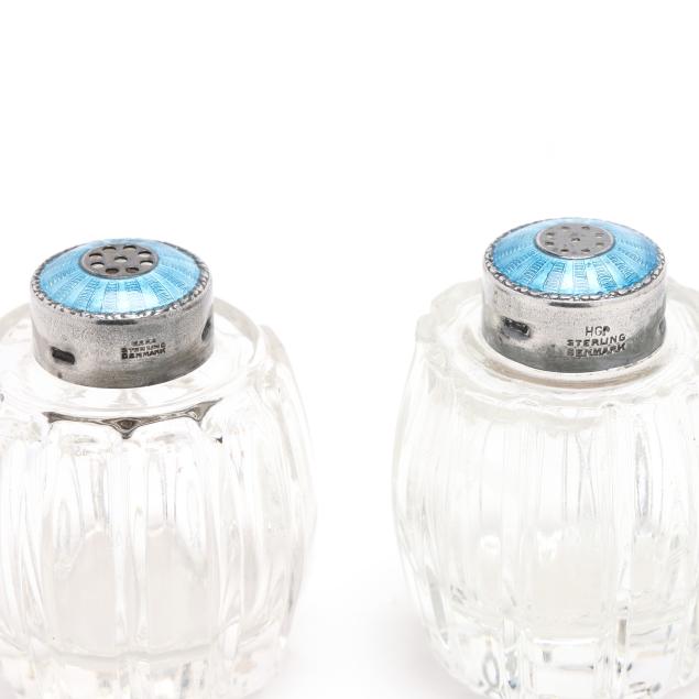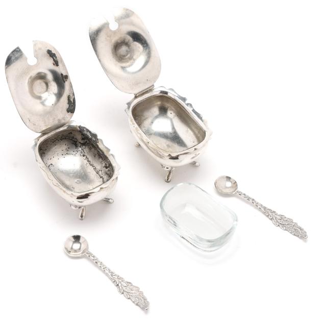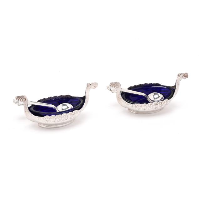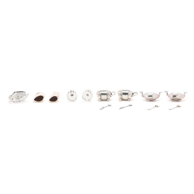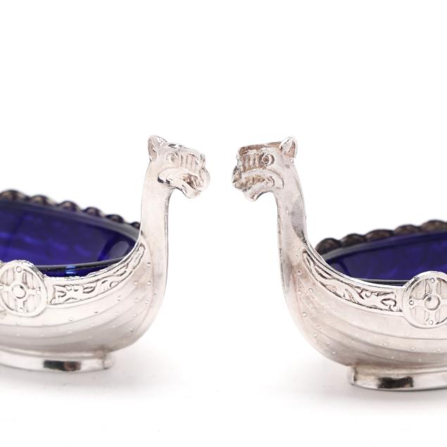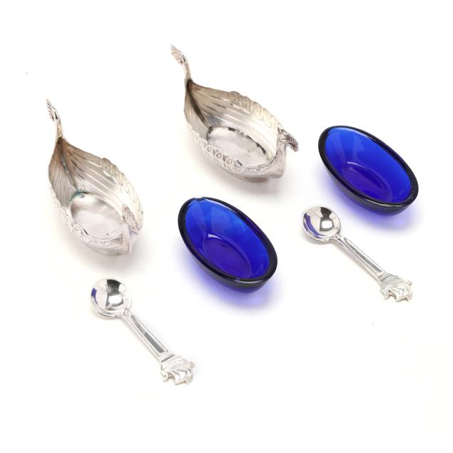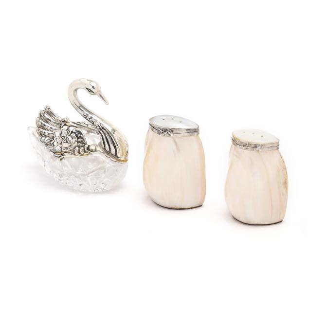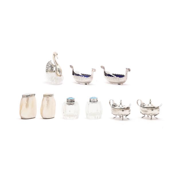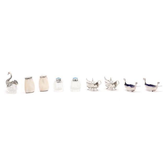 Includes a pair of Swedish sterling Dragestil viking ship salt cellars with cobalt inserts, paired with two Swedish sterling ship salt spoons; a pair of Italian .800 silver salt cellars, Florence, circa 1944-1968; a pair of Danish sterling mounted glass salt shakers, mark of Meka, with blue guilloche enameled lids; a pair of silver mounted mother of pearl shakers, not marked, content unknown; a silver-plated mounted crystal swan form master salt cellar; and (2) sterling silver salt spoons; not monogrammed.