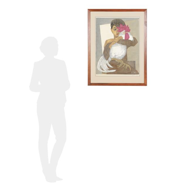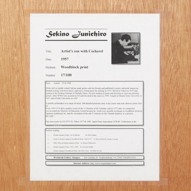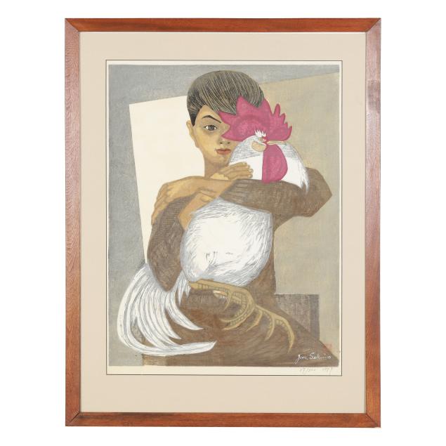 Dated 1957, woodblock print, a large print showing a young boy holding his prized rooster, visually the boy and rooster combine as one face, showing the boy's tenderness and admiration he feels for his pet, with a red artist seal to lower right corner of image together with signature in white pigment by artist, Jun Sekino, in lower margin is the edition number 17/100, and date 1957, presented under glass with mat in a warm brown wood frame.