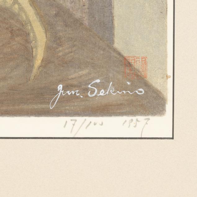 Jun'ichiro Sekino was a Japanese printmaker best known for his portraits of kabuki actors, sumo wrestlers, and geishas. His woodblock prints were completed in a style that merged both Western and Japanese aesthetics. The artist went on to study under Koshiro Onchi, the founder of the sosaku-hanga movement, which encouraged self-expression in artists. It was with Onchi in Tokyo where Sekino learned Japanese woodblock printing, Western-style etching, and painting. He won the Teiten Prize for etching in 1936, became a member of the Nihon Hanga Kyokai (Japan Print Association), and began teaching at Kobe University in Japan in 1965. Sekino died in 1988 in Tokyo, Japan. His works are in the collections of the Art Institute of Chicago, The Museum of Modern Art in New York, and the Museum of Fine Arts in Boston, among others.
