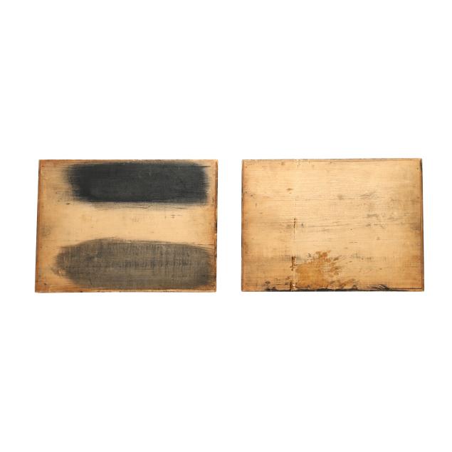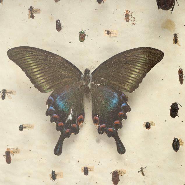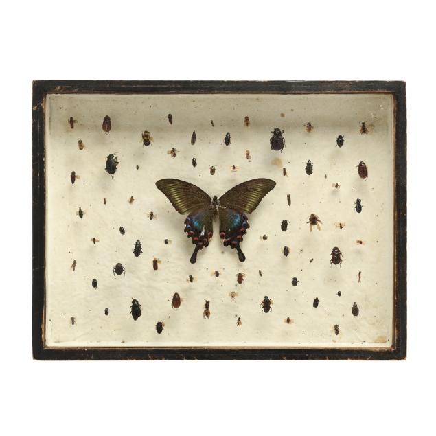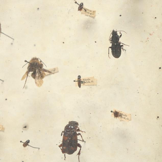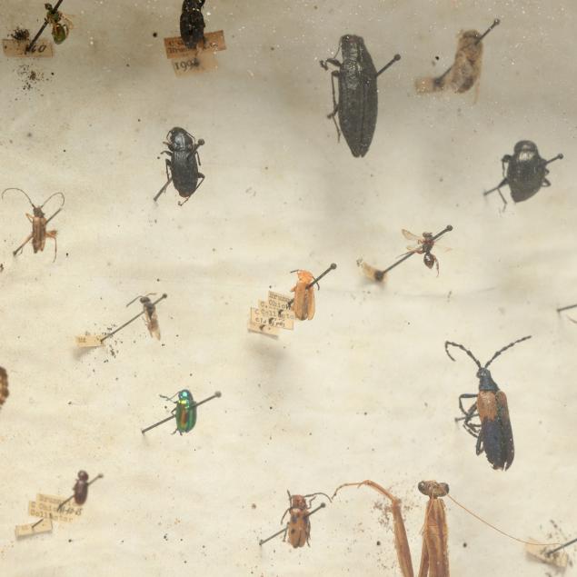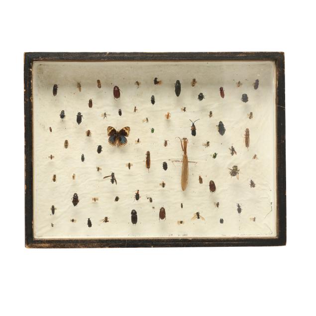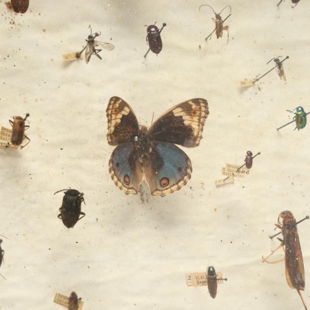 Circa 1960s, two shadowboxes with pinned and labeled insects, presumably used for entomological observation.