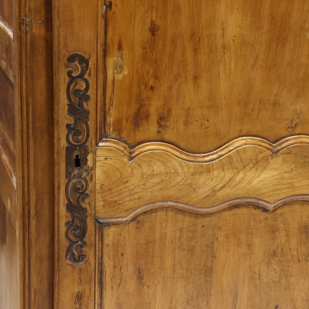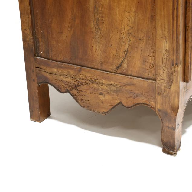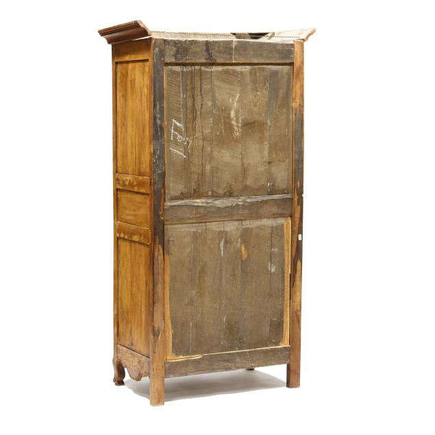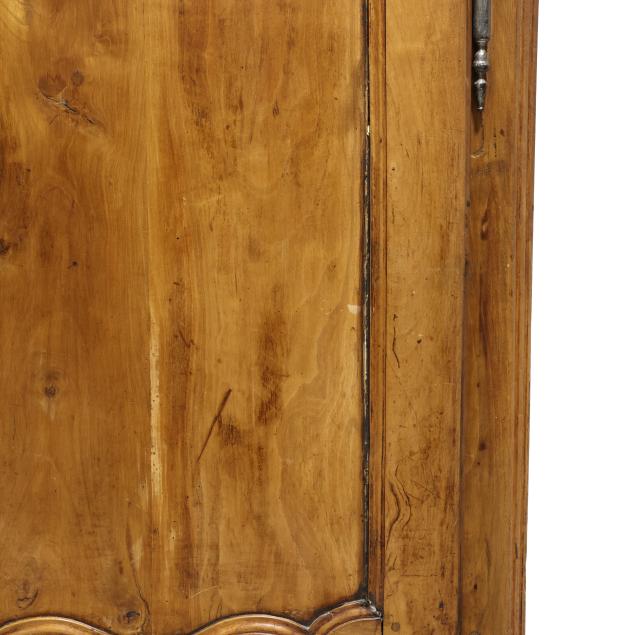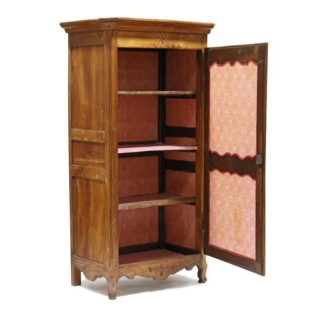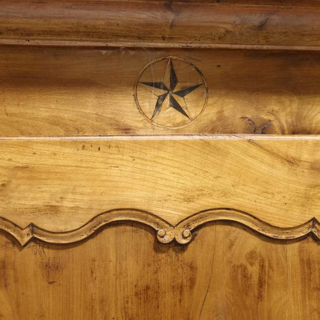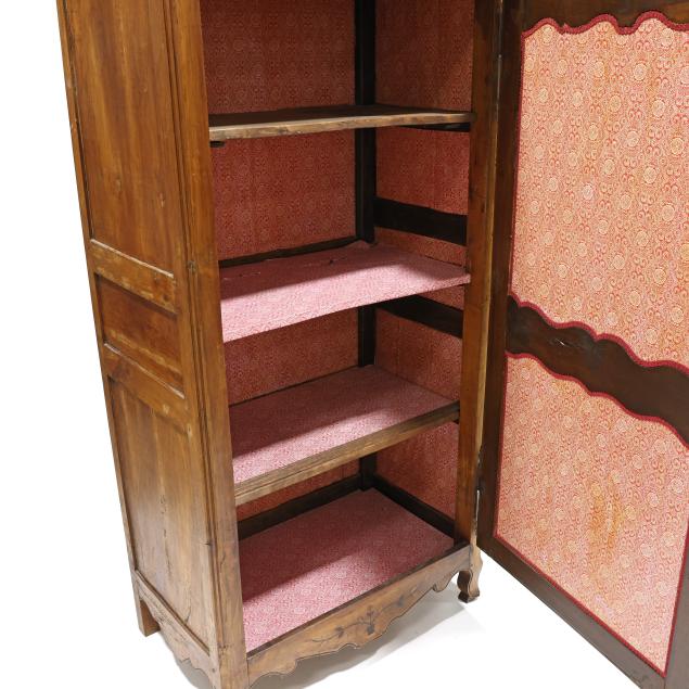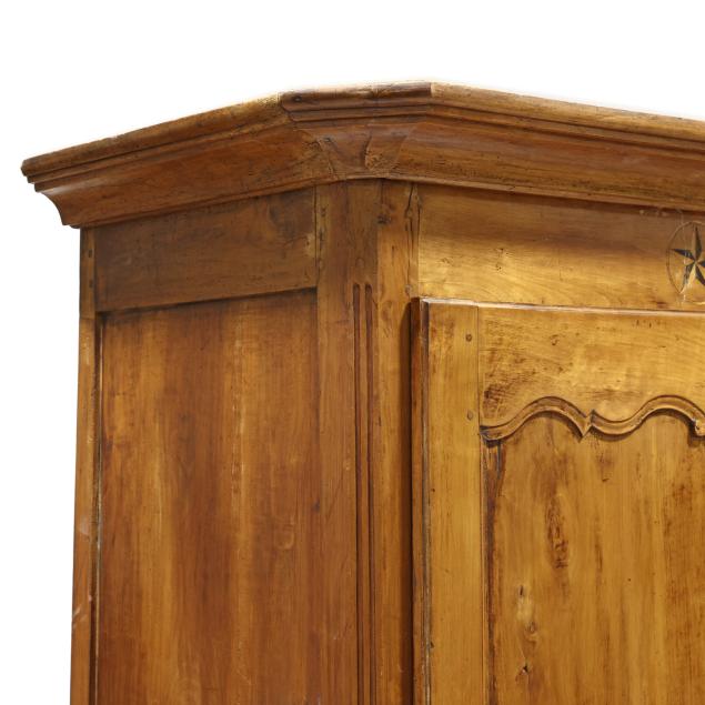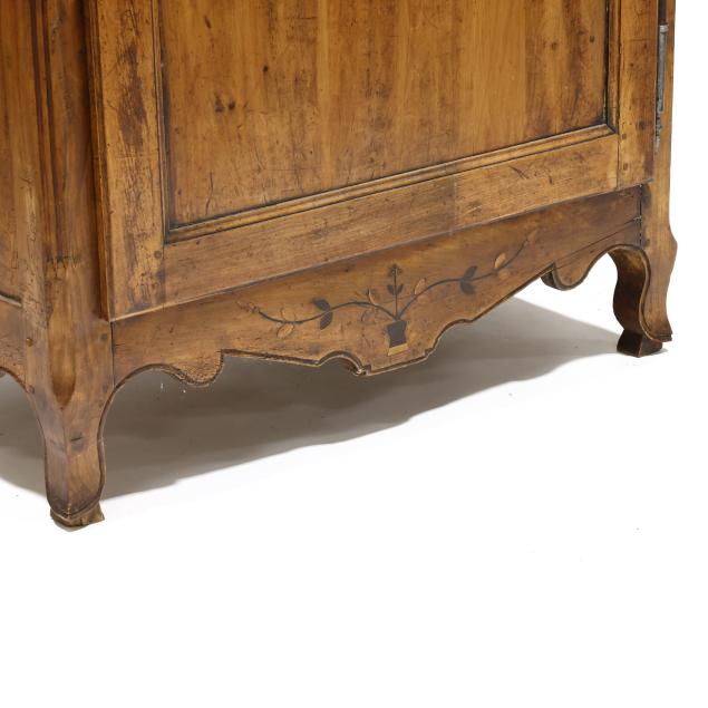 18th century, pine secondary, one-part form, removable cove molded cornice, star inlaid frieze, single hinged door with shaped double panels, steel mounts, shelved interior with later paper lining, paneled case sides, scalloped skirt with urn and flowering vine inlay, cabriole feet.