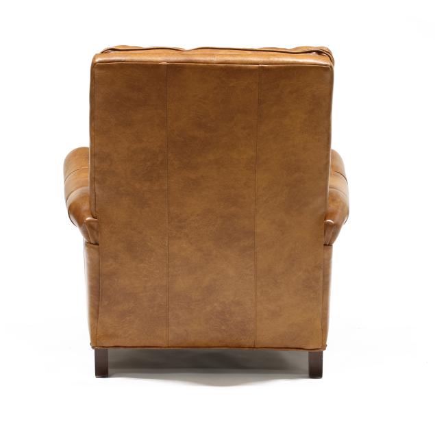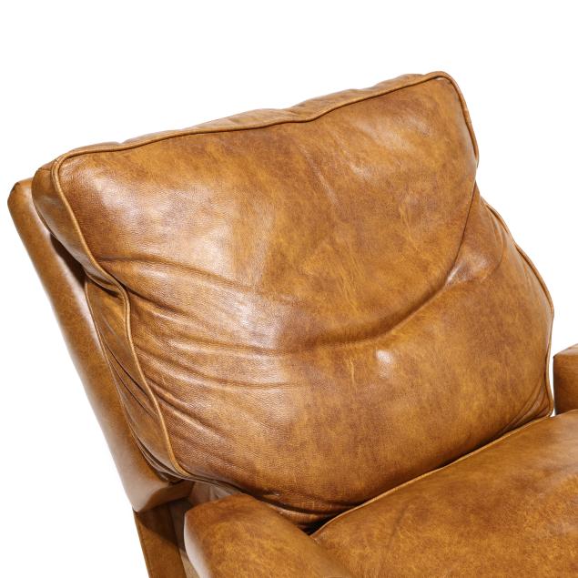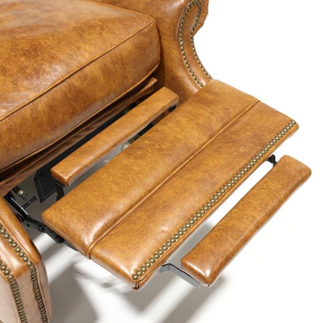 Late 20th century, brown leather with affixed back cushion, velcro seat cushion, reclining back with pop-out foot rest, brass tack trim, turned wood feet, labeled.