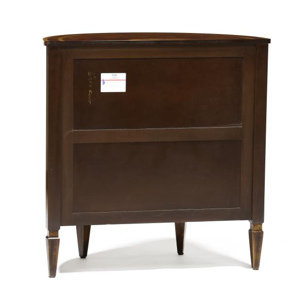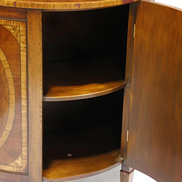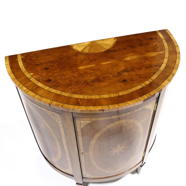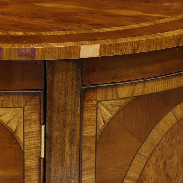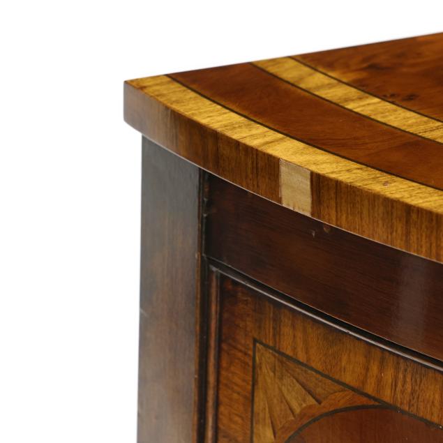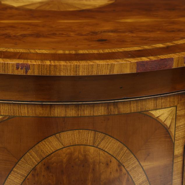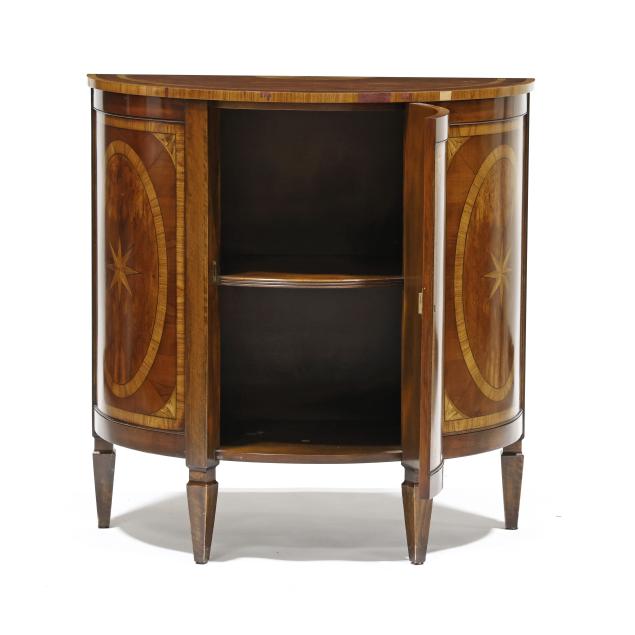 Late 20th century, mahogany, burl yew wood and mixed wood veneers, top with half paterae and banded inlays, single hinged door, shelved interior, the door and case sides with inlaid star and oval banding inlay, tapered feet.