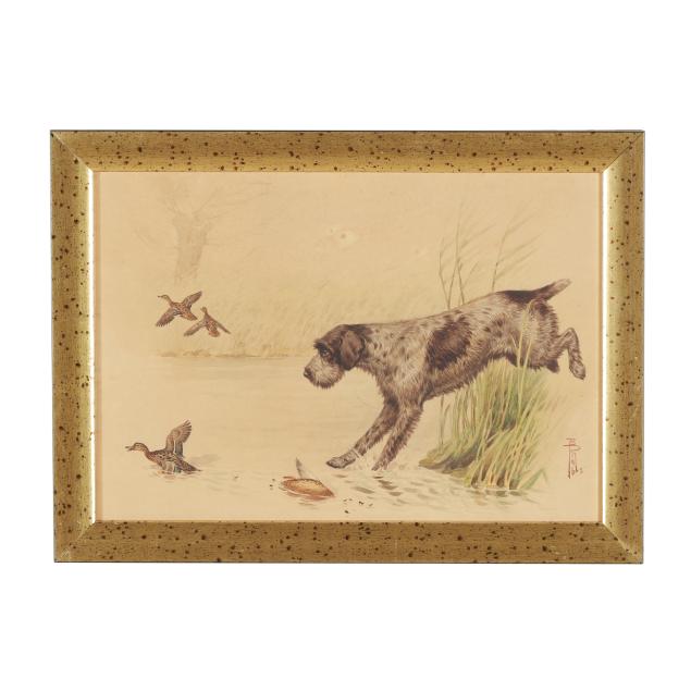 Riab’s work, focused on pointers, retrievers, ducks, and pheasants, appeared in major French sporting publications and was widely published by Parisian lithography firms. He exhibited at the Salon des Animaliers and remained active into the 1950s, producing commissions and prints now highly prized by collectors.
