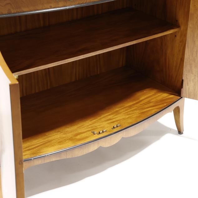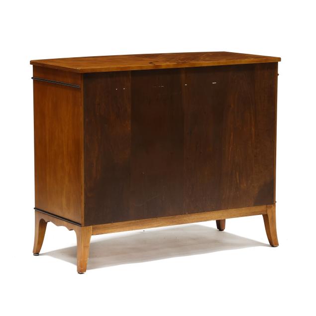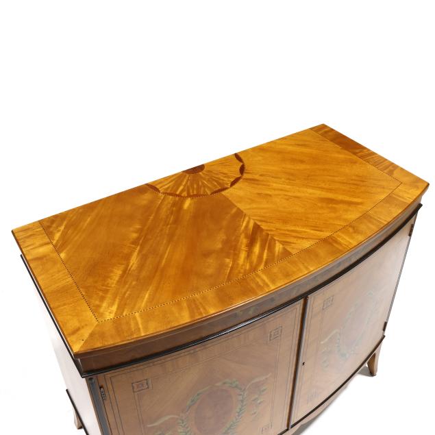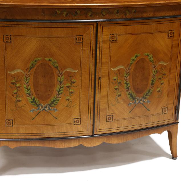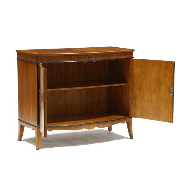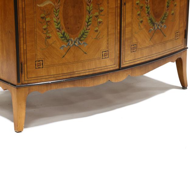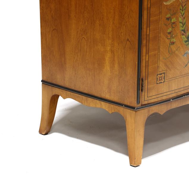 Late 20th century, figured mahogany, light and dark wood inlays, top with inlaid 1/2 paterae, banded inlay, painted berry and leaf frieze over two hinged panel doors with banded inlays and painted laurel wreath, shelved interior, French bracket feet, labeled.