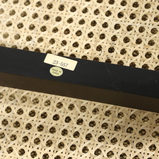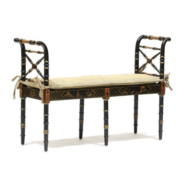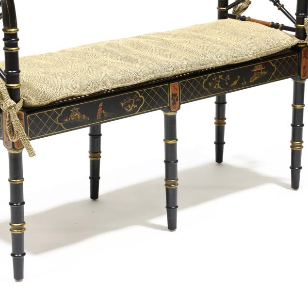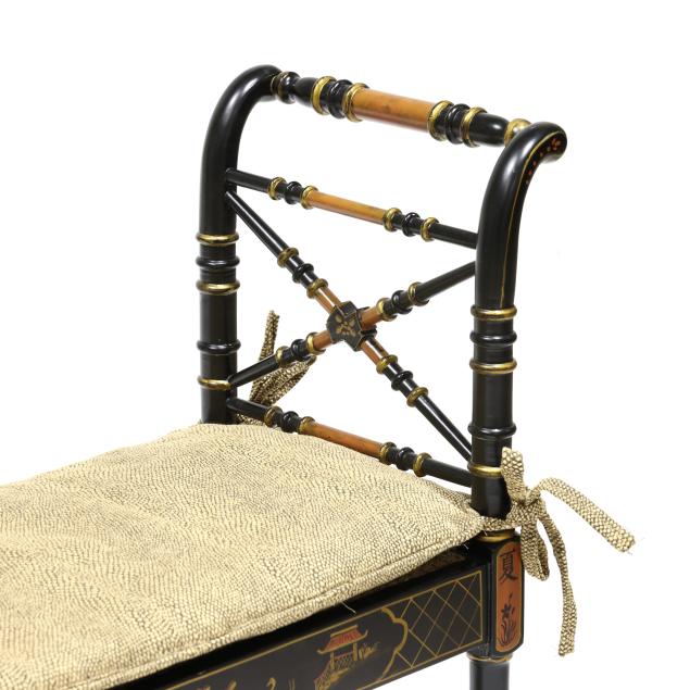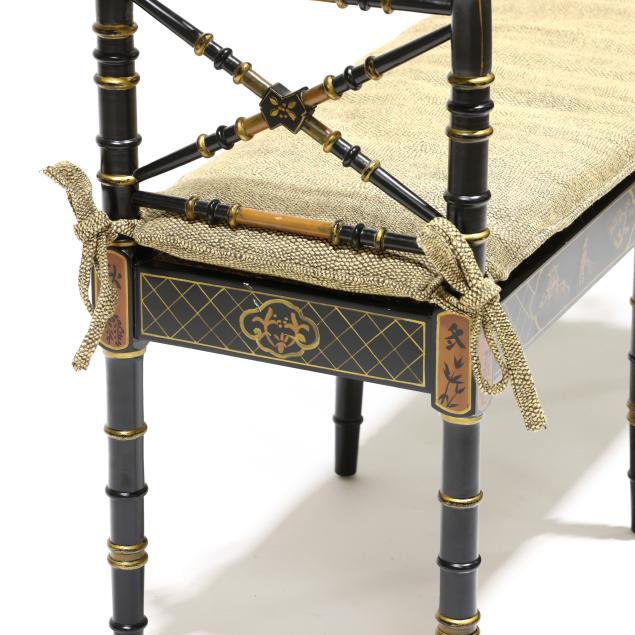 Contemporary, black painted wood with gilt and painted Asian motifs, cane seat, upholstered cushion, faux bamboo legs, labeled.