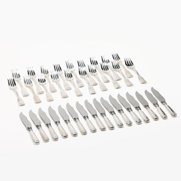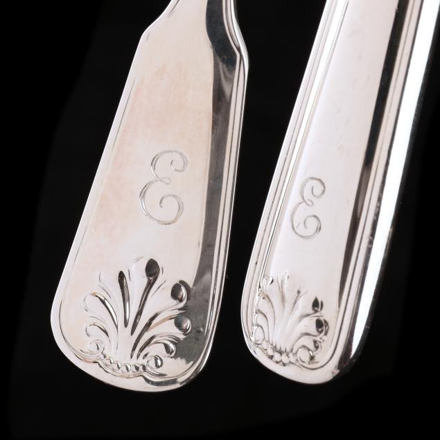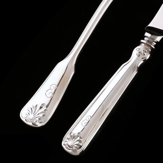 Contemporary, (35) pieces to include: (16) knives (8 in.); (18) forks; and (1) salad fork; all with a script "E" monogram to the handle, presented in a fitted case.