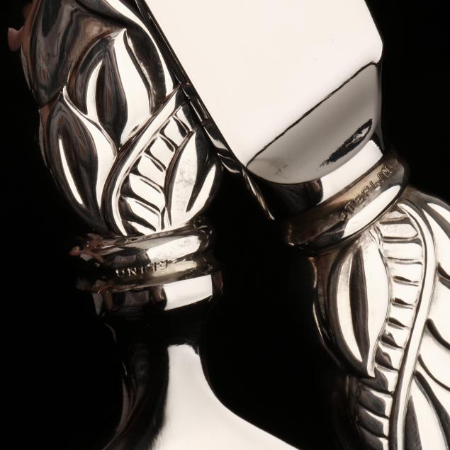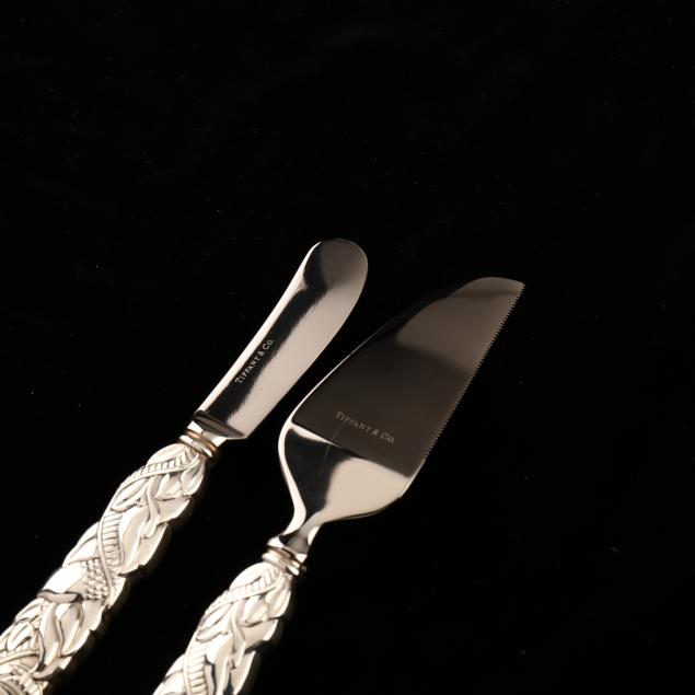 Contemporary, featuring uniform foliate handles, includes a cheese knife and spreader; presented in a fitted Tiffany & Co. leatherette retail box, not monogrammed.