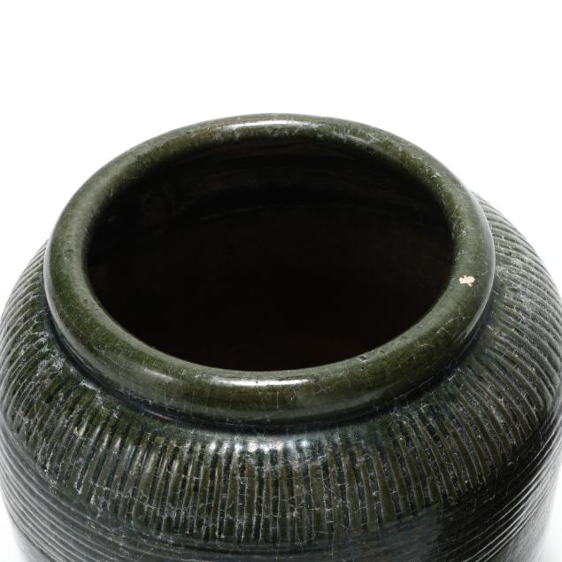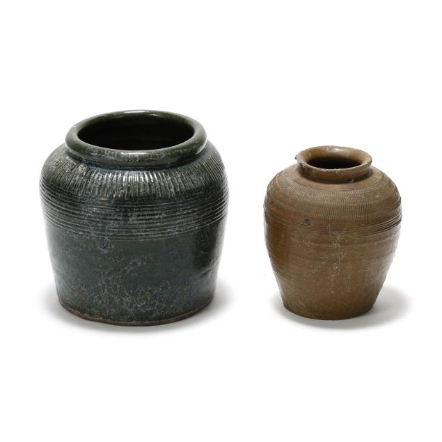 Late 19th- early 20th century, turned and glazed stoneware, unsigned, each similarly decorated with incised vertical hachure decoration to the shoulder above horizontal ring tooled bands, the smaller slight more ovoid in alkaline type glaze, the larger in dark green glaze.