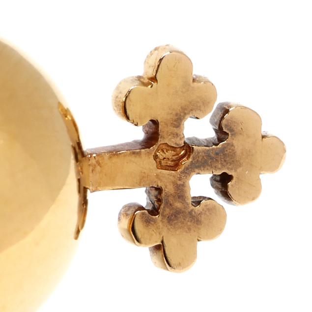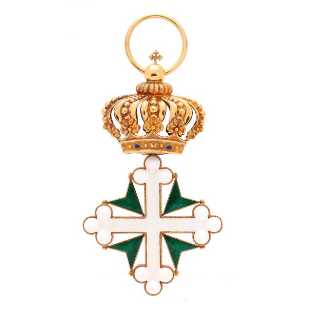 The three-dimensional crown surmount with enamel details over a white enamel cross with green guilloche enamel accents, with large circle bail, with impressed mark to top of crown, crown and cross edge XRF testing 20-21KT, bail XRF testing 18KT.