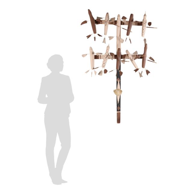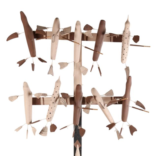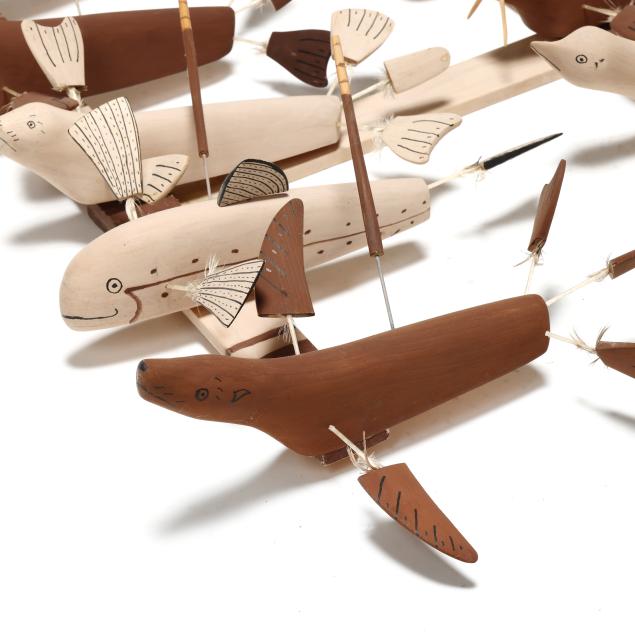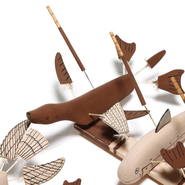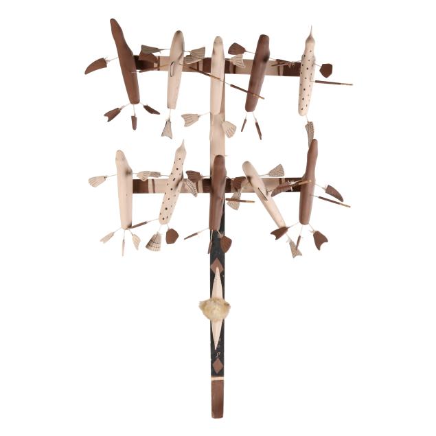 Nunivak Island, unsigned, polychrome painted carved wood and natural feathers, the cruciform implement mounted with seal, salmon, walrus, and bird effigies, all harpooned by an Inuk hunter trailing in kayak.