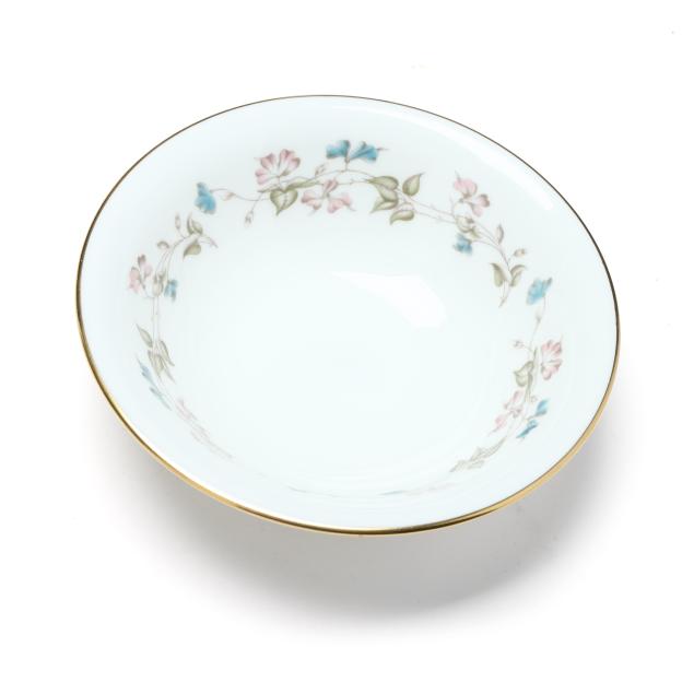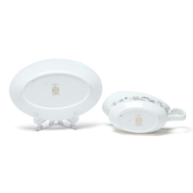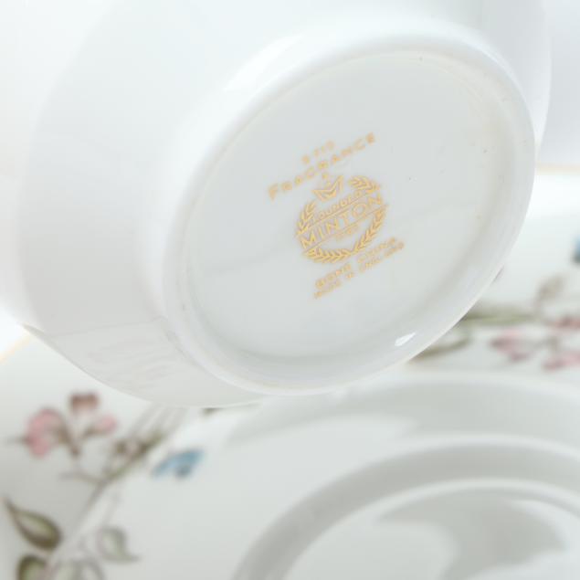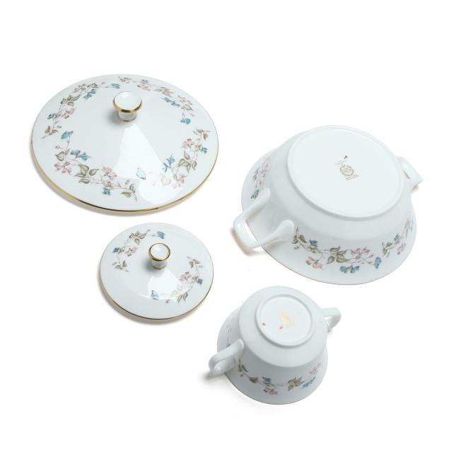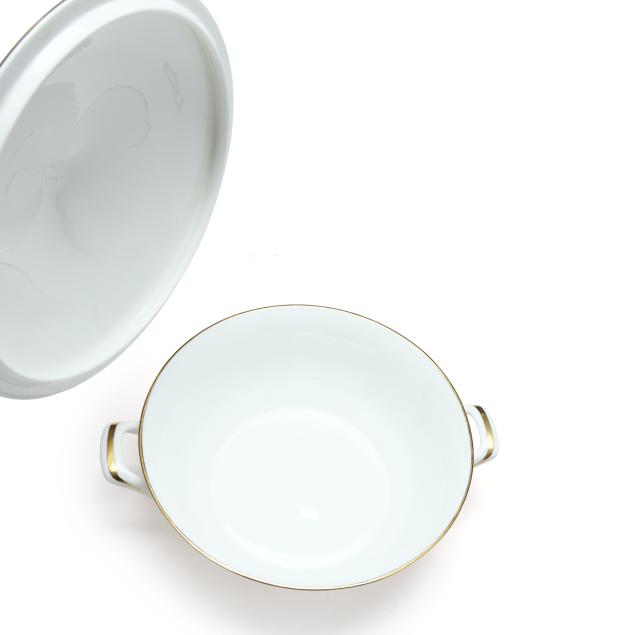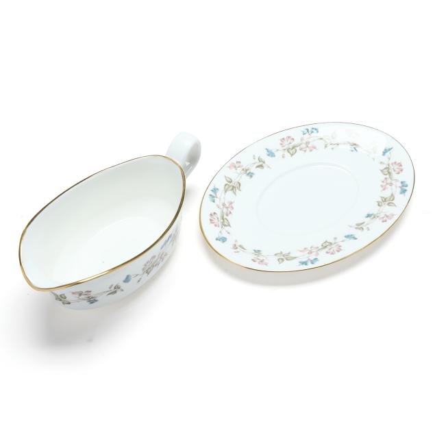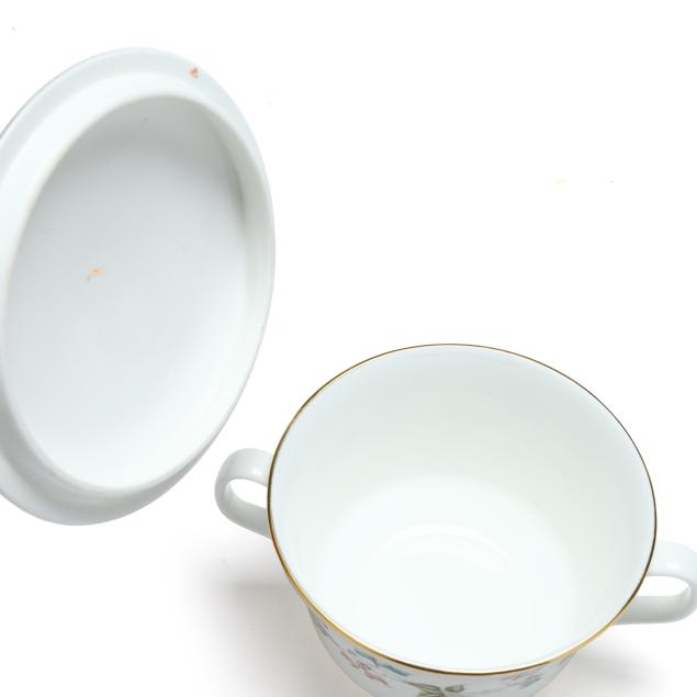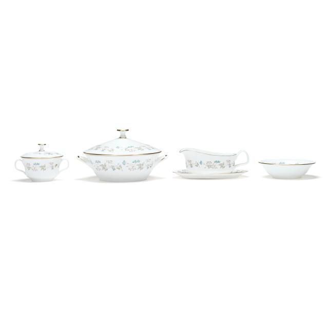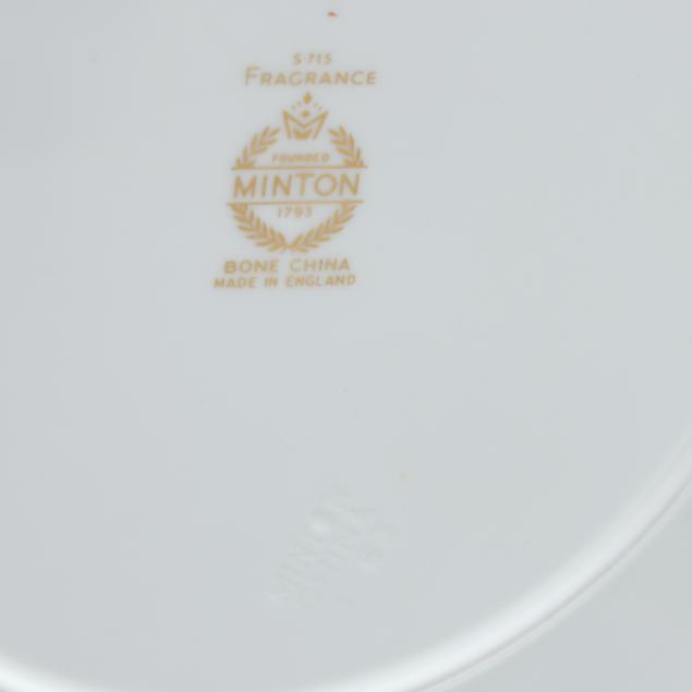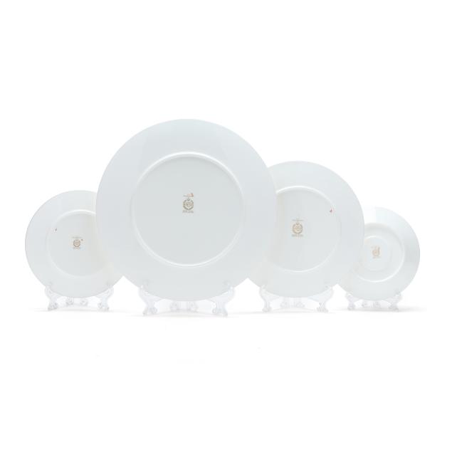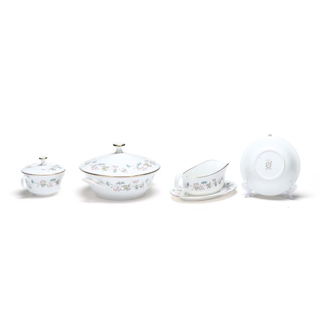 (76) pieces, England, 1962-9, bone china with gilt trim to include (11) dinner plates (10 3/4 in.); (12) salad plates (8 1/4 in.); (12) bread and butter plates (6 3/8 in.); (14) coupe cereal bowls (6 3/8 in.); (10) flat cups (2 3/4 in.) and (13) saucers (5 5/8 in.); a gravy boat and underplate (underplate 8 1/2 in.); a lidded sugar/sauce tureen (4 1/2 in.); and a covered vegetable tureen (10 1/4 in. diameter), all marked with company backstamp to underside.