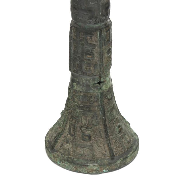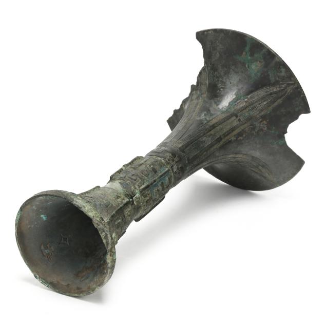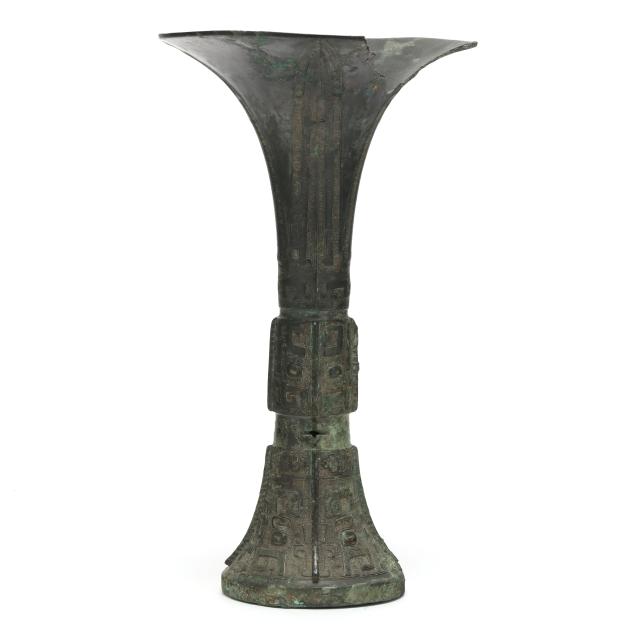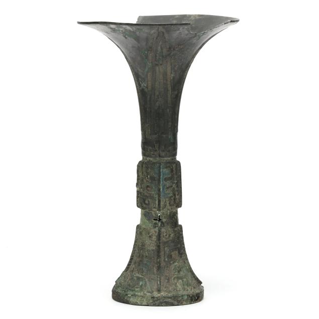 gu, the slender vessel has a trumpet neck and mouth, body divided into three sections, the top with four elongated leaves with