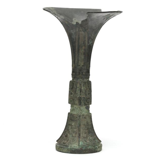 Probably late Shang dynasty, 12th-11th century BCE, a finely cast bronze ritual wine vessel