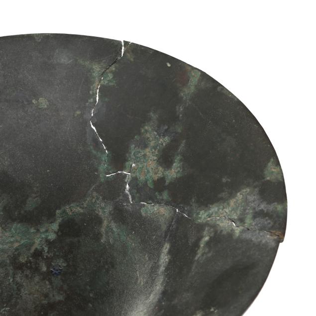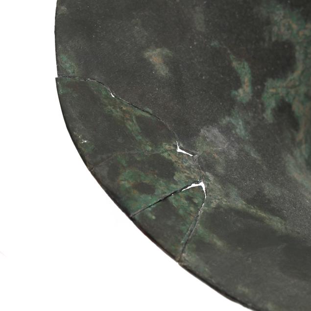Broken pieces from mouth rim remain with the object, please see photos; areas of oxidation commensurate with age.