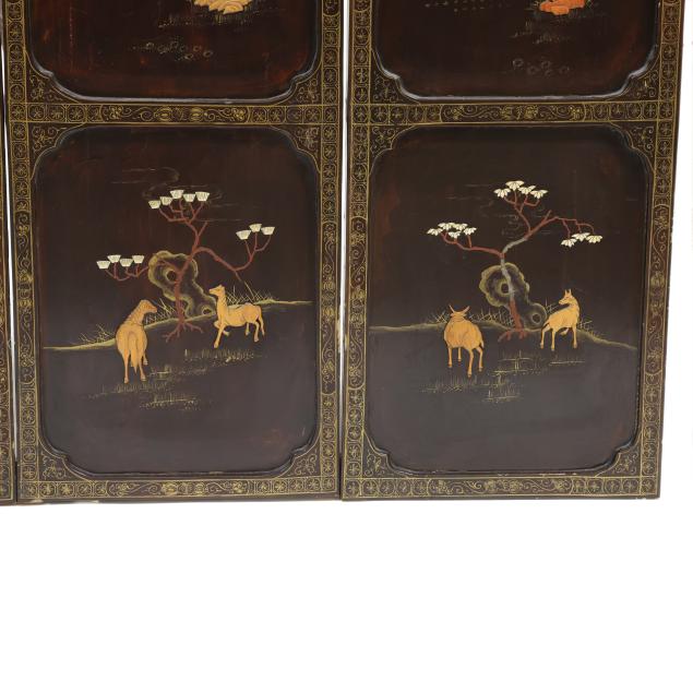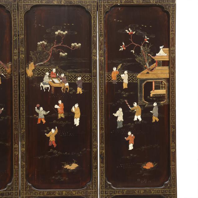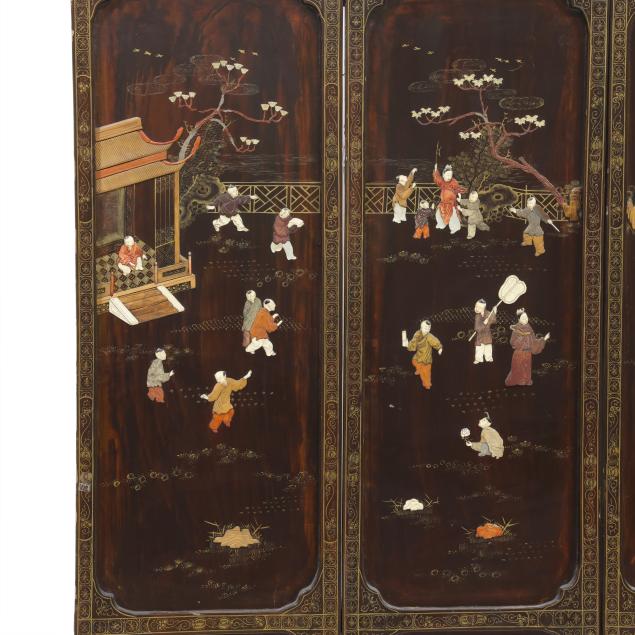 Qing dynasty (1644-1912), 19th century, a dark wood lacquer four panel screen, the front divided into two sections, the upper section depicts a joyous gathering symbolizing "One Hundred Boys," Chinese boys are depicted in marvelous stone inlay and gold pigment playing in a garden villa, in sections below pairs of deer, horses, and oxen are depicted grazing under trees in stone inlay and gold pigments, all within a gold painted border, the reverse side has is painted in gold with birds and flowers above fruit arrangements.