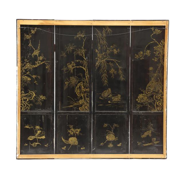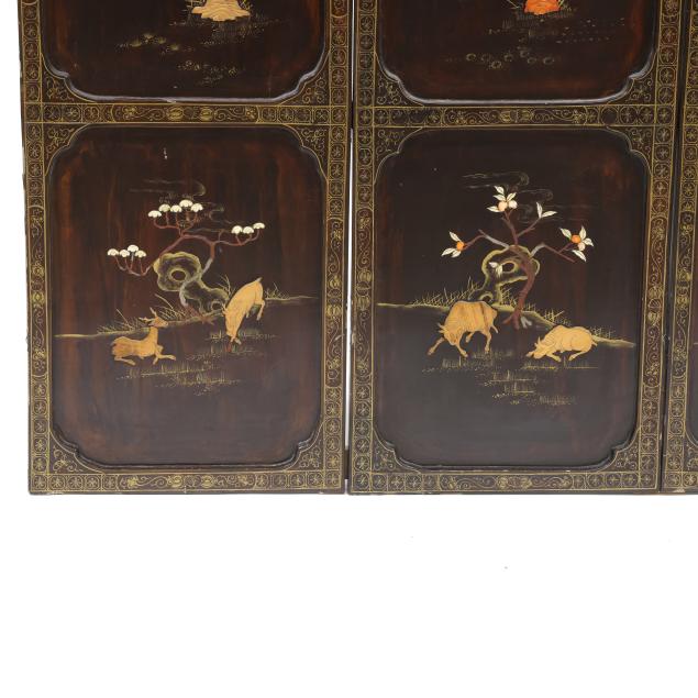 Private Collection, Chapel Hill, North Carolina Some nicks and loss to raised edges of border; scattered areas of cracking to panels; some loss to inlay on trees; the screen has been secured to a wooden frame to hang on a wall; reverse side with more areas of cracking to surface.