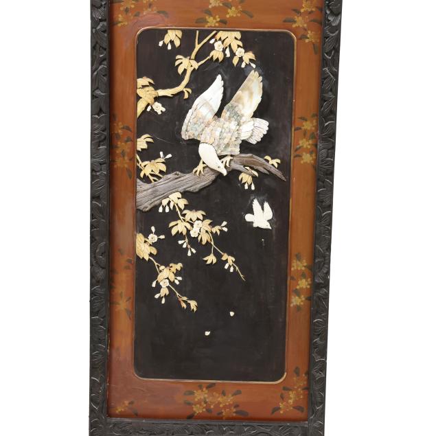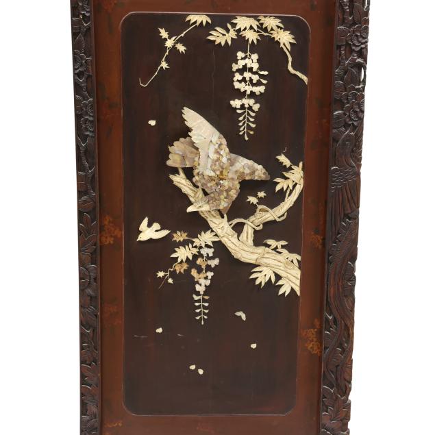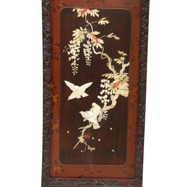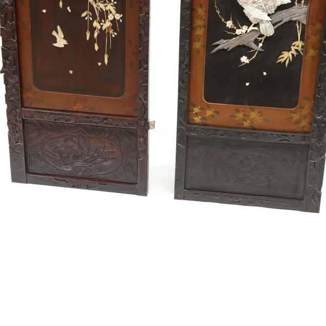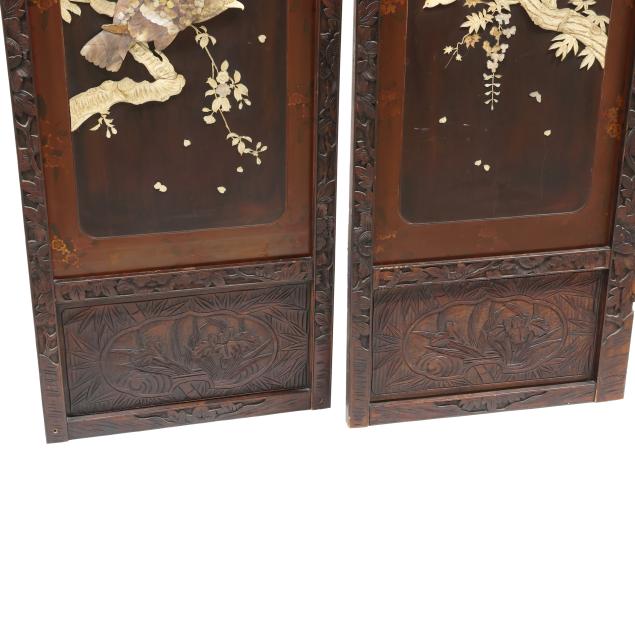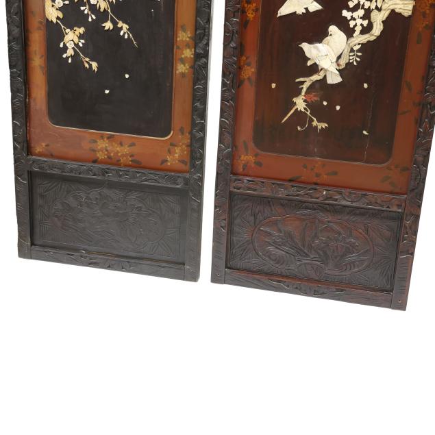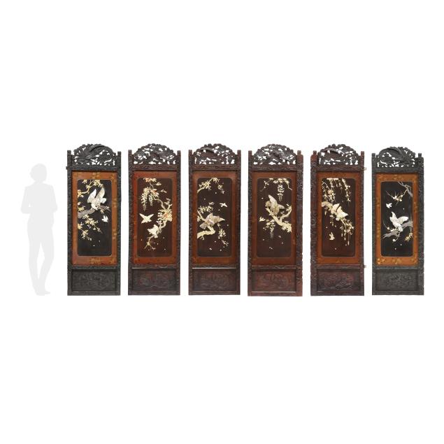 Meiji period (1868-1912), six carved hardwood panels inset with lacquer and painted panels populated with birds and flowers in high relief inlay of mother of pearl and bone, reverse side lacquered in red and painted with trees and hills, top and sides of each panel with ornate carving to frame.