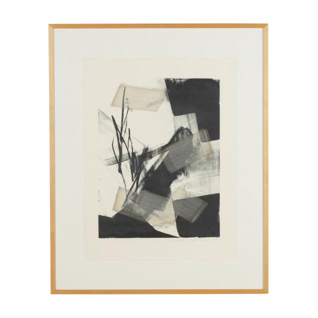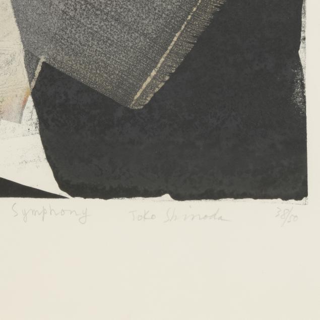 Lithograph with hand coloring, pencil signed in lower margin Toko Shinoda, titled "Symphony", and numbered 38/50, presented under glass with full print visible, a mat surrounds, in a light wood frame.