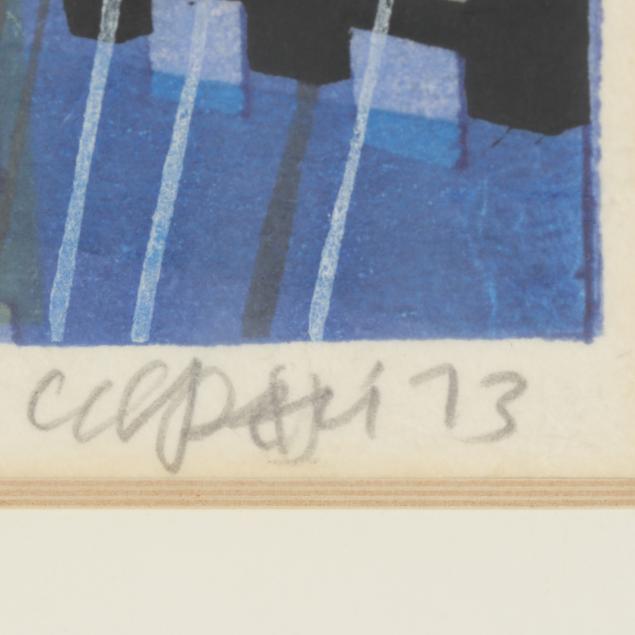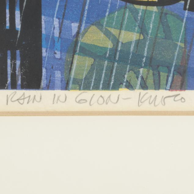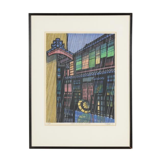 Woodblock print, pencil signed to lower margin with 21/50 edition, titled "Rain in Gion-Kyoto," and artist signature with date CKarhu 73, framed by Kato in Tokyo, presented under glass with mat in black frame.