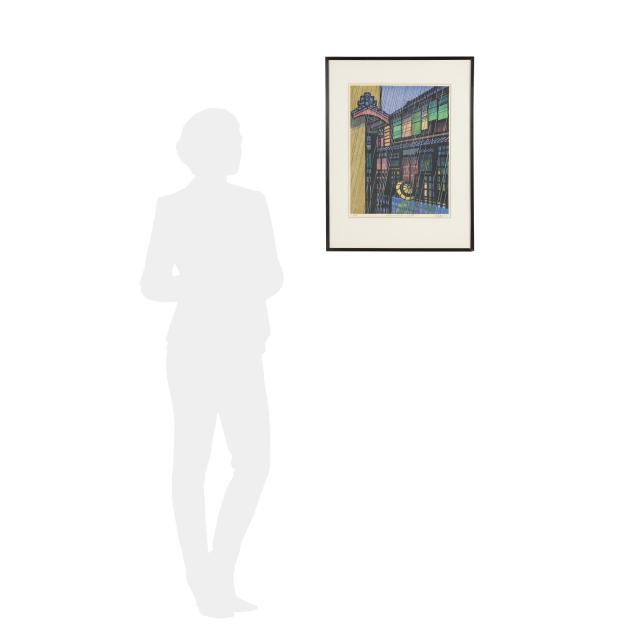 Clifton Karhu was an American born in Minnesota, but drew his inspiration from Kyoto and its charming scenery, where he lived with his wife the second half of his life. His skilled woodblock prints capture traditional Kyoto landmarks and landscapes in vibrant color with bold use of black outline, still retaining the Japanese spirit with attention to season and weather to give them a surreal signature appearance.