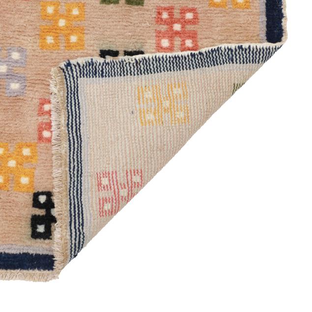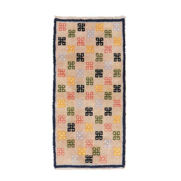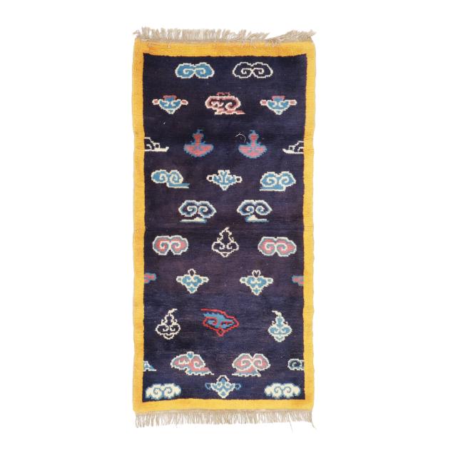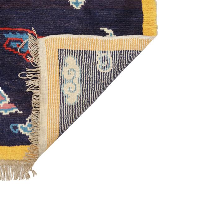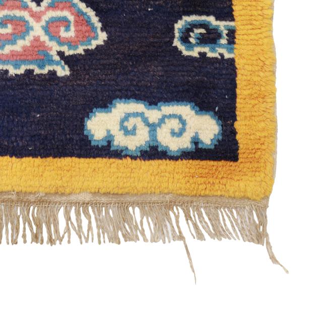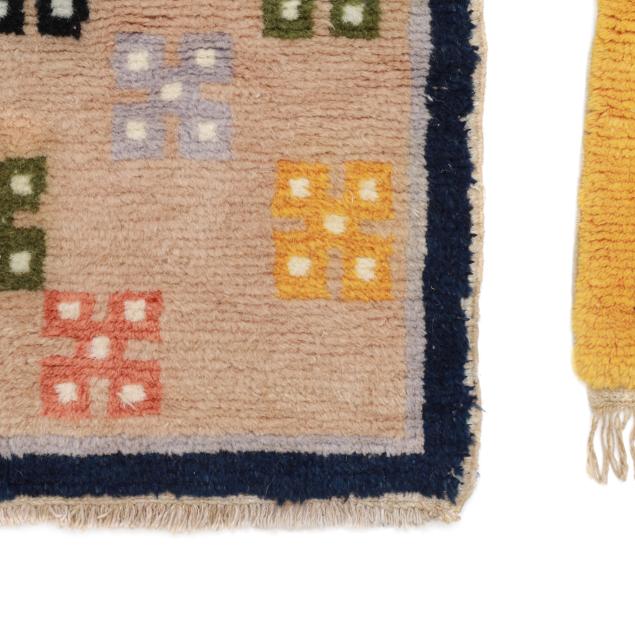 Wool on cotton foundation; the first with cloud motifs on navy blue field with yellow border; the second with tan field and multicolored quatrefoil motifs with blue border.
