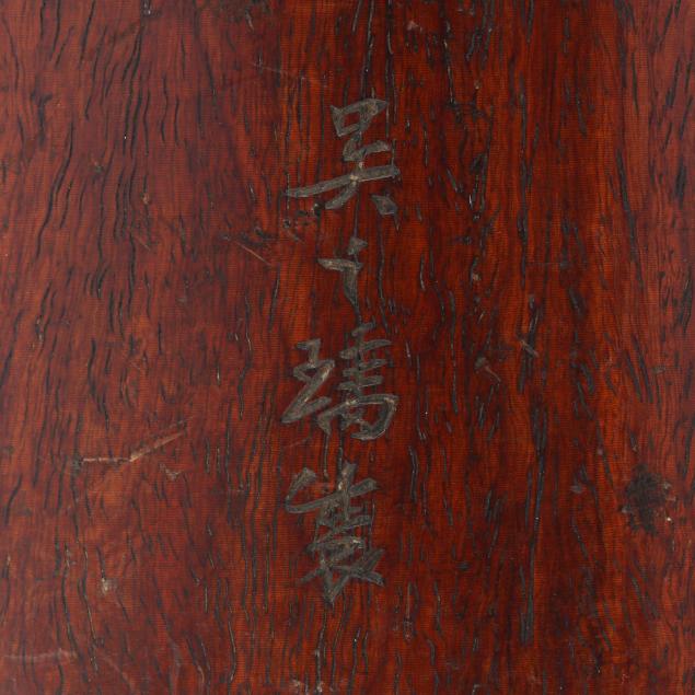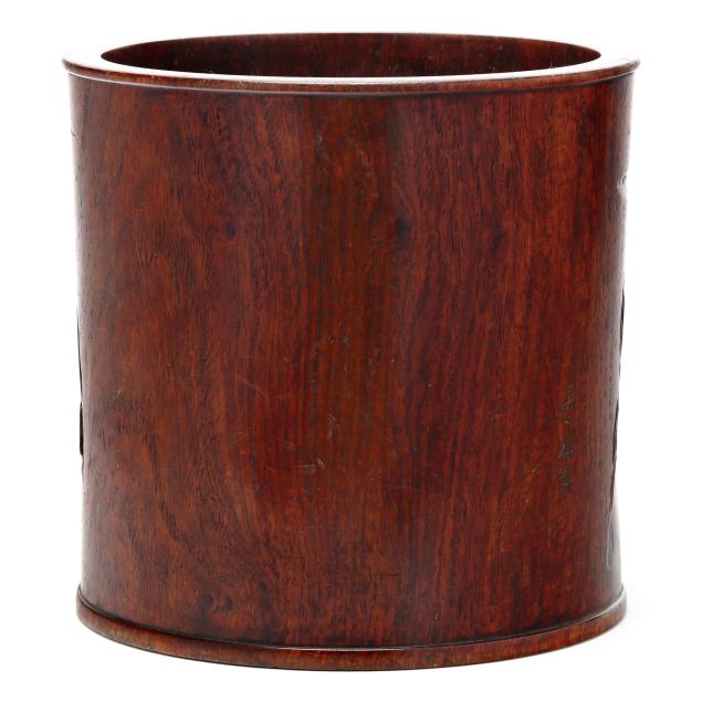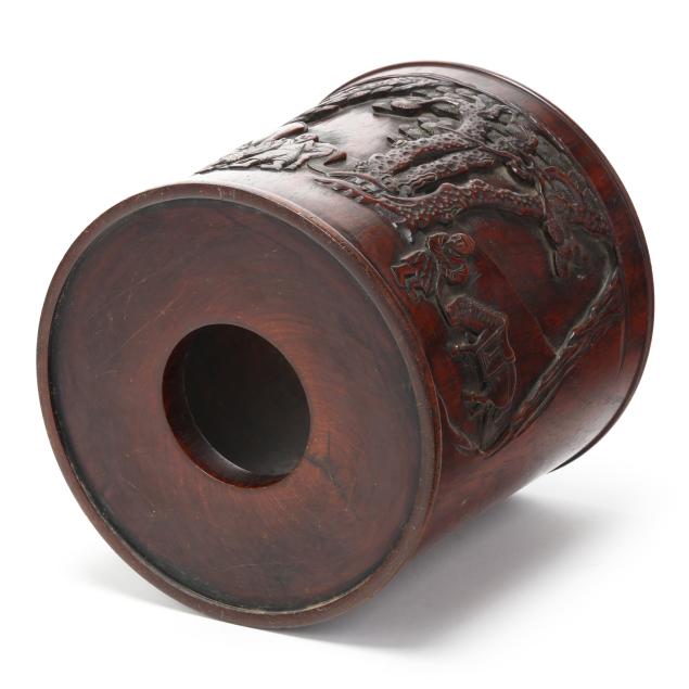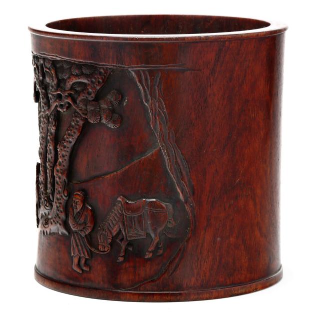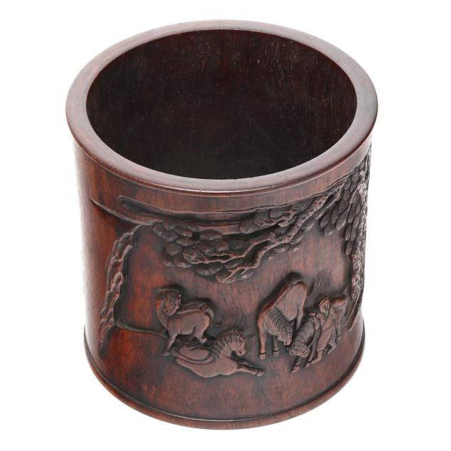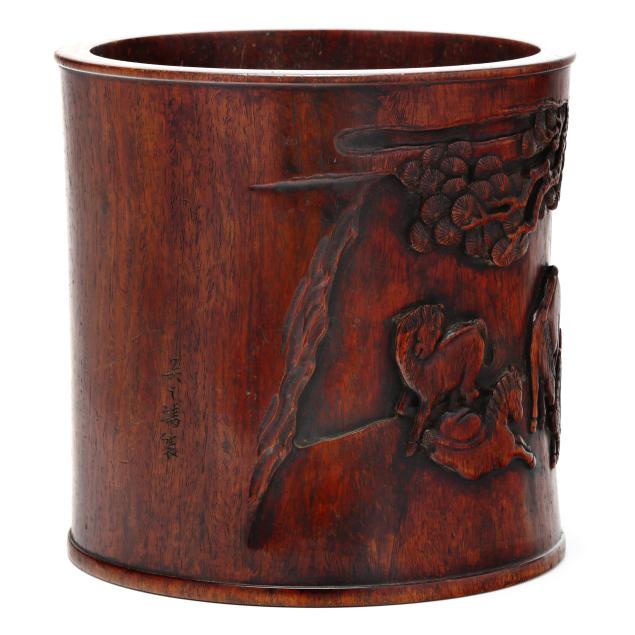 A carved brush pot with shaped register decorated in relief with a landscape scene of five horses attended by two male figures under a knotty pine tree canopy, a three character Chinese inscription to outside edge of scene.