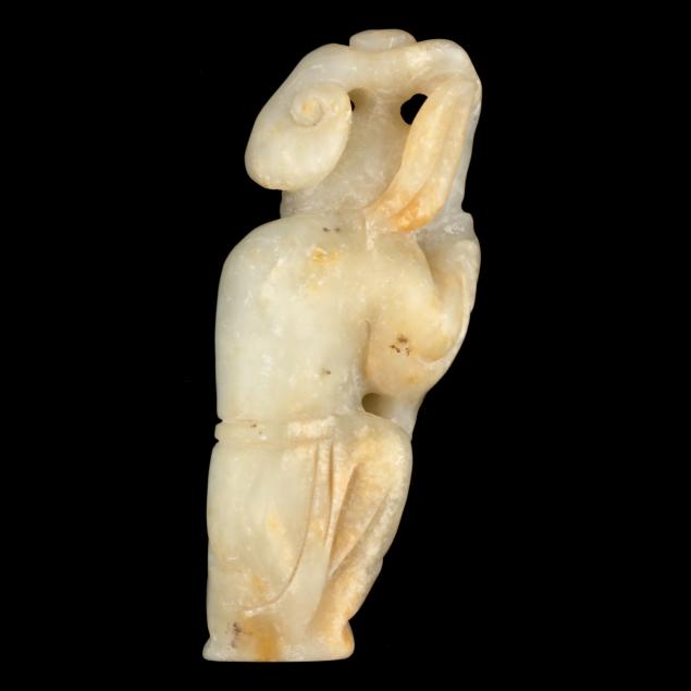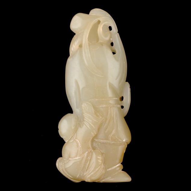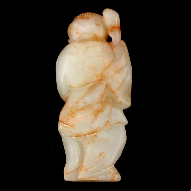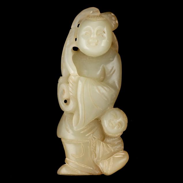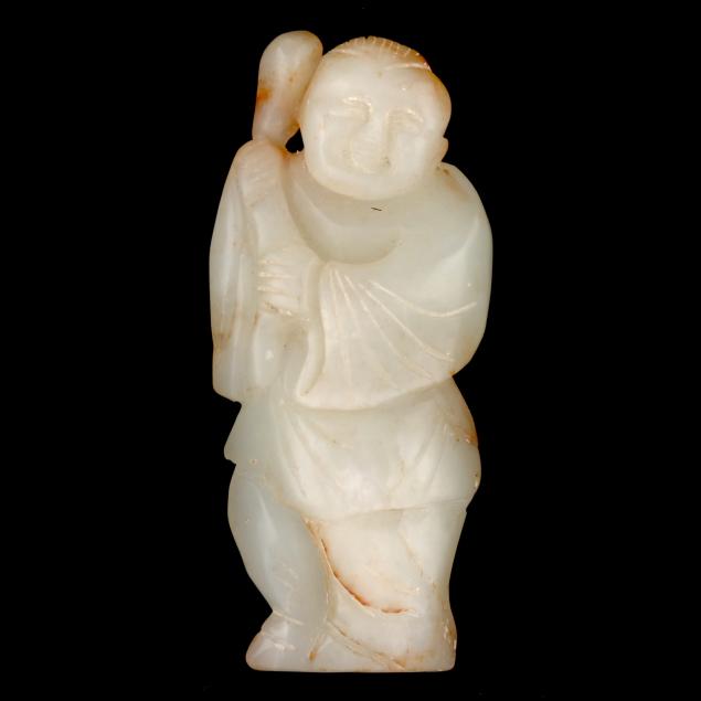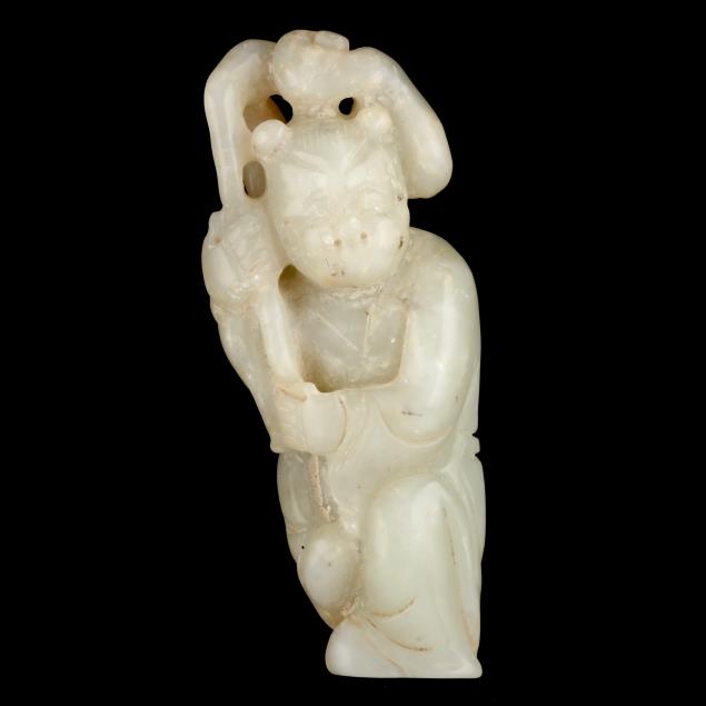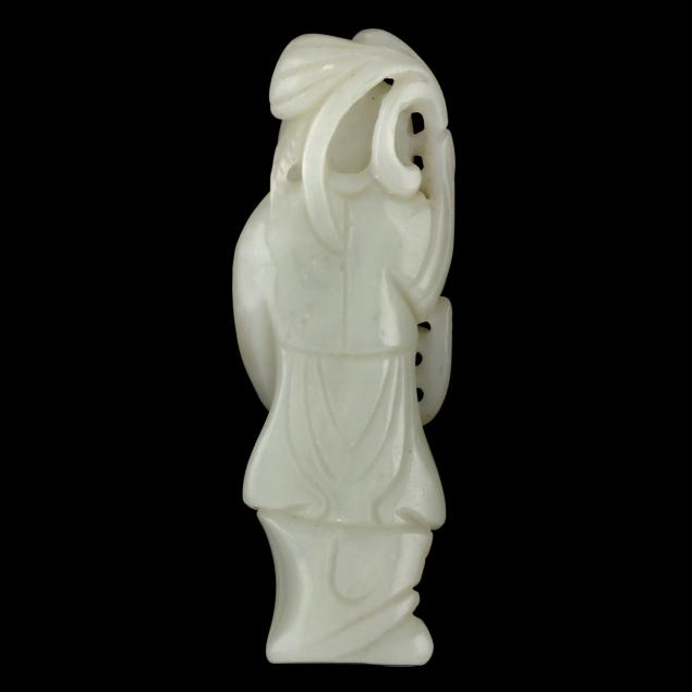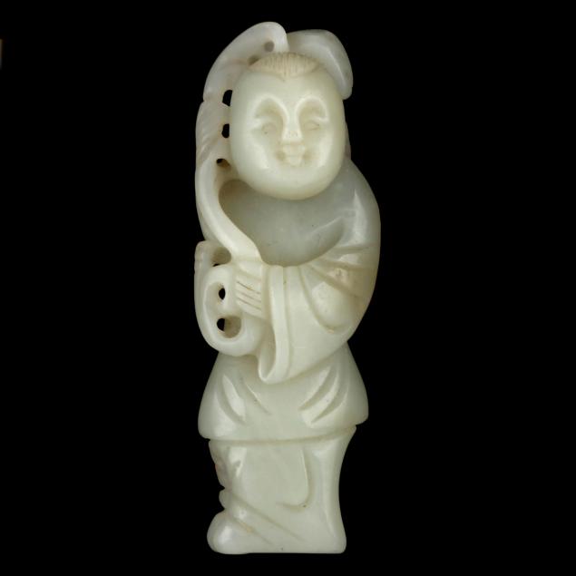 19th or 20th century, four Chinese figures carved from light celadon green and white hard stone, possibly jade, dressed in loose robes, each holding up flowers or staff.