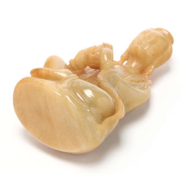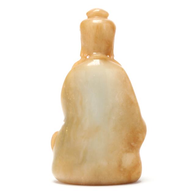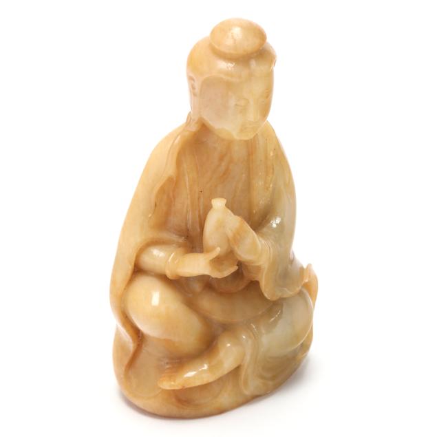 Qing dynasty (1644-1912), 19th century, an elegant figure of Guanyin finely carved from a light yellow green tone stone with russet and white inclusions, possibly jade, the Bodhisattva of Compassion is depicted seated wearing loose robes and holding a vase containing the elixir of immortality.