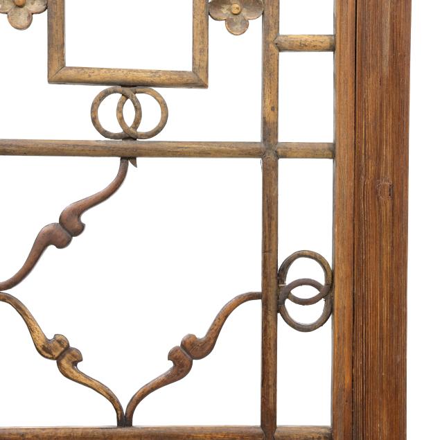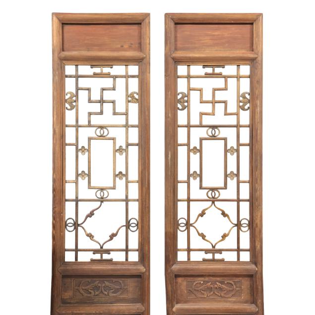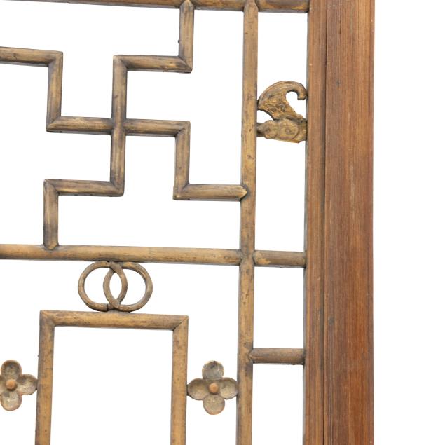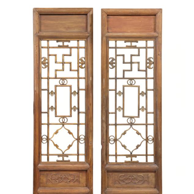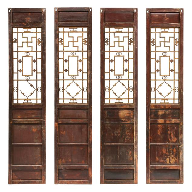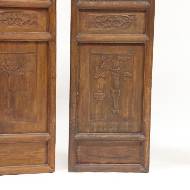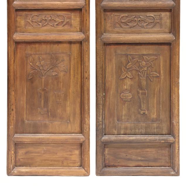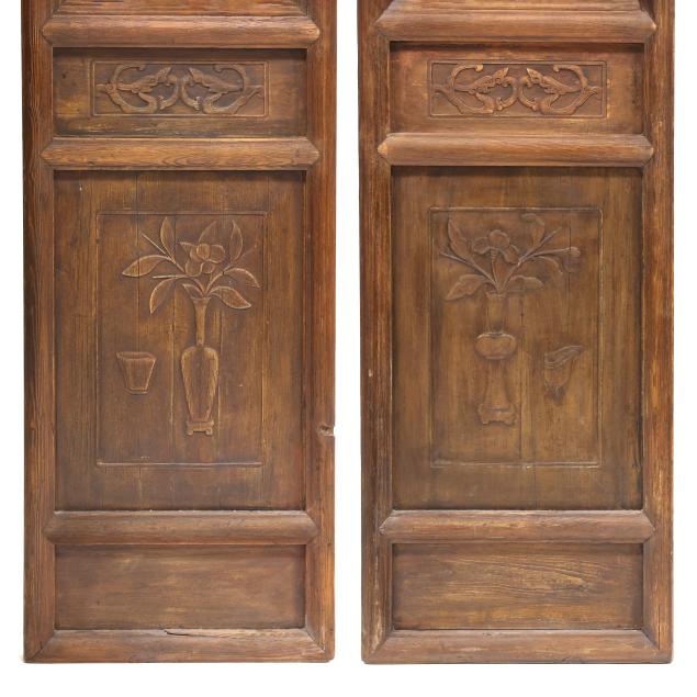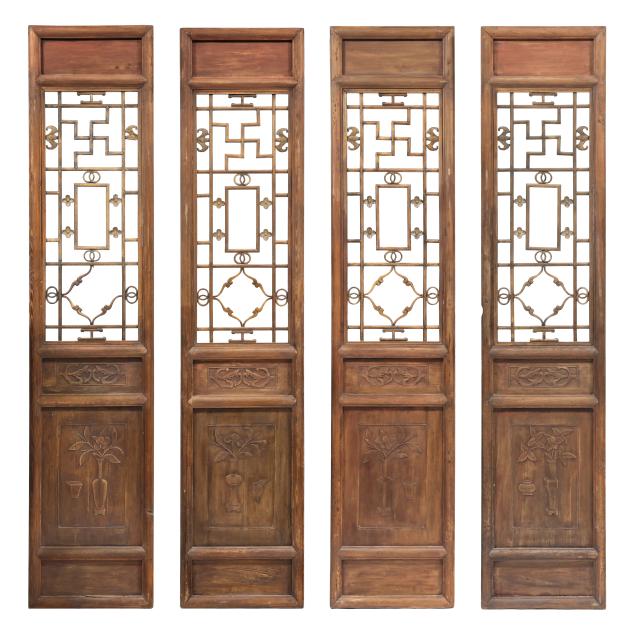 19th or 20th century, a set of four carved wood doors that would have originally graced the exterior of a courtyard home, recessed panels at top and bottom, the ones at bottom are relief carved with archaic vessels and vases filled with flowers, the reticulated window section is elegantly carved with Chinese auspicious motifs such as bats, double coins,