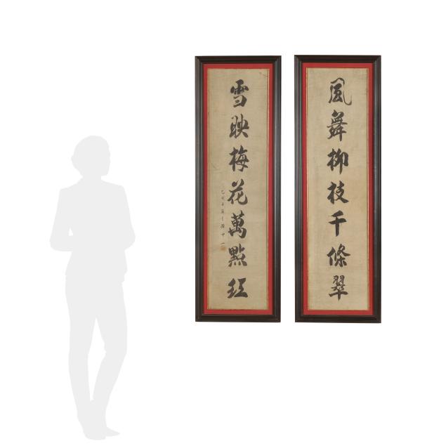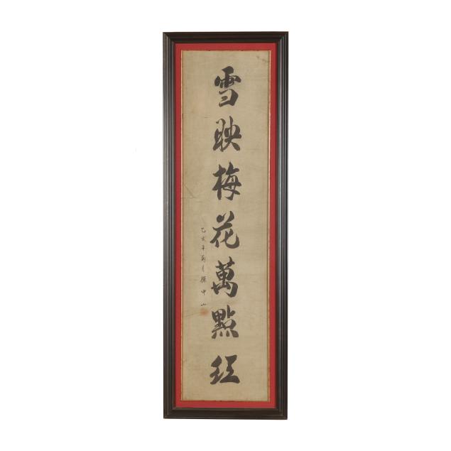 Private Collection These scrolls were thought to be by San Yat-Sen (Chinese, 1866-1925) because they are signed 孫中山 (Sun Zhongshan). This was a name used to refer to Sun Yat-Sen after the establishment of the Republic government. Zhongshan is the Chinese pronunciation of his Japanese pseudonym, Nakayama (中山). However, the red artist seal on this set is not a known seal that he used.