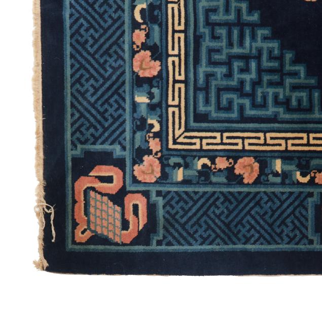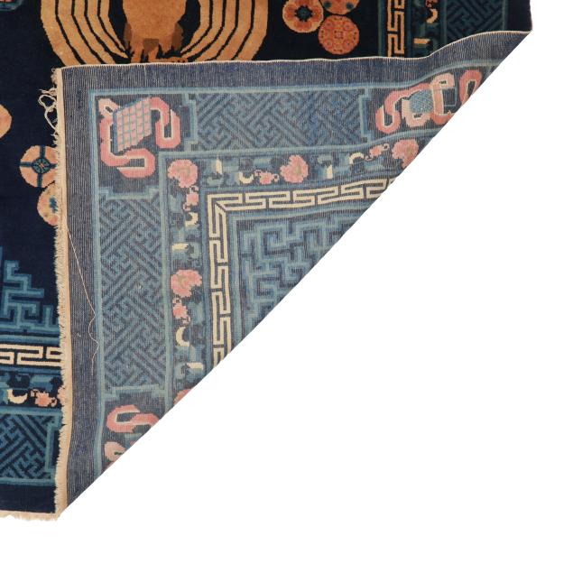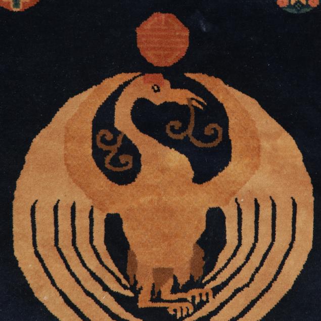 Mid 20th century, wool on cotton foundation, the navy field with central circular bird motif surrounded by round decorative motifs, with lattice spandrels, the main border with various motifs and snakes, with minor floral and greek key borders.