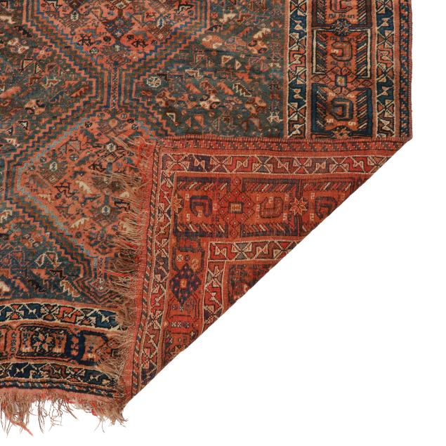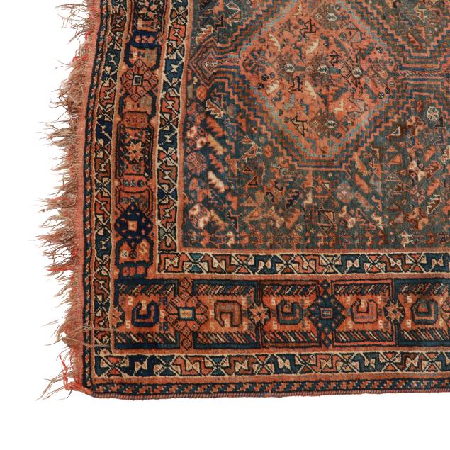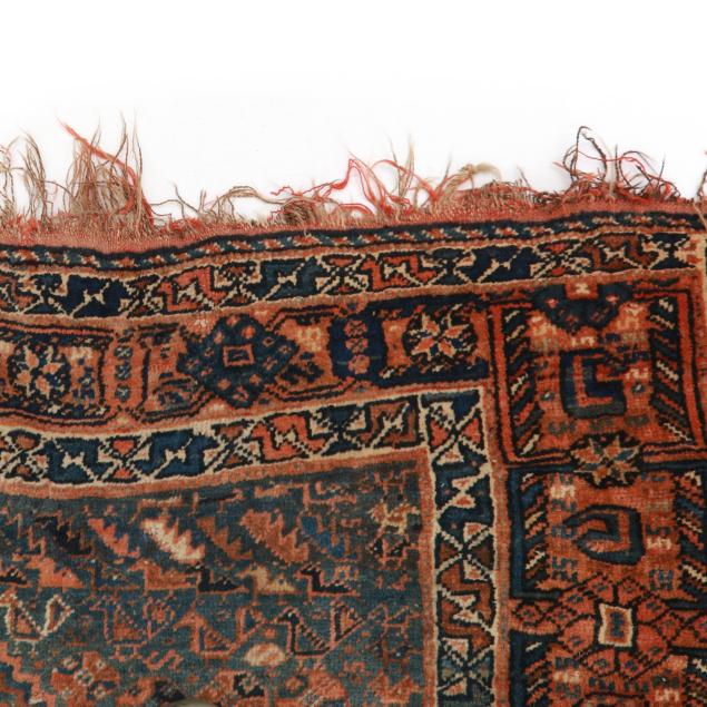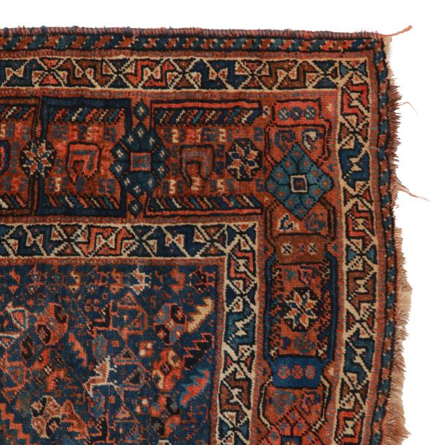 Wool on wool foundation, the central blue field filled with small avian and animal motifs and poled 3-diamond motif in light brown filled with animal and avian and stylized palmette motifs, the main border with repeating stylized boteh in squares joined by rosette or star motifs, within minor geometric borders.