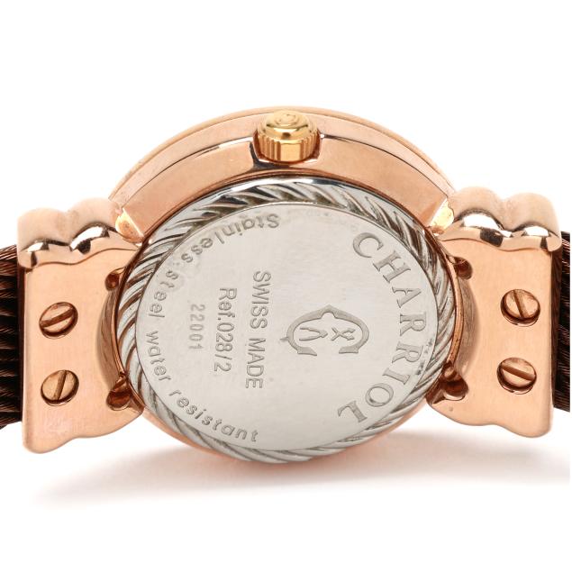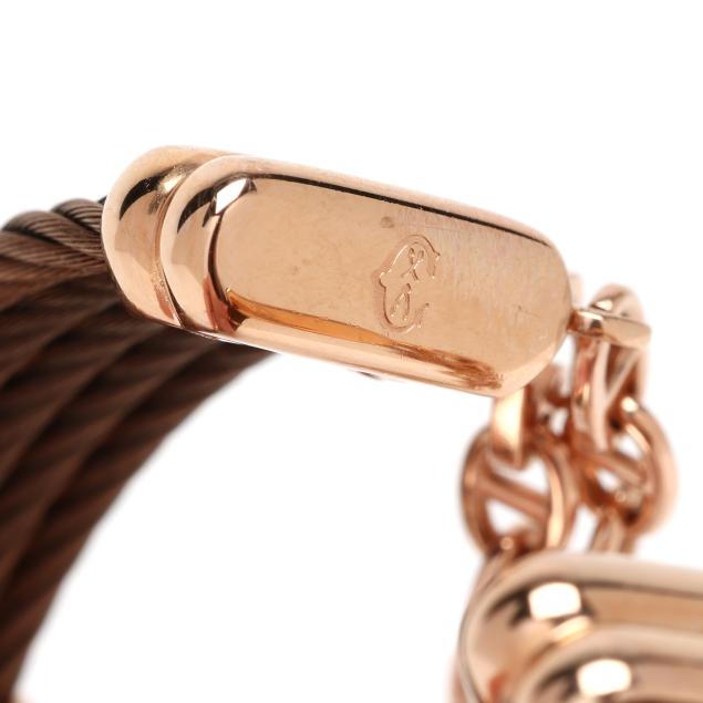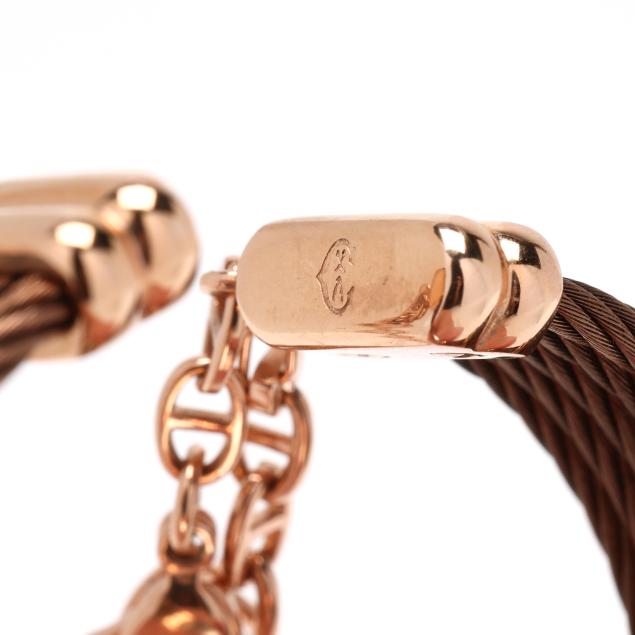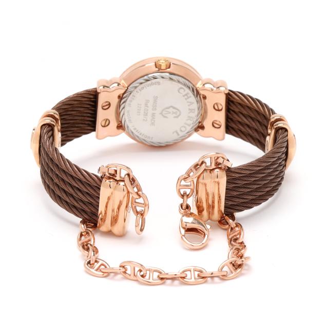 Quartz, ETA 901.001, reference number 082/2, serial number 22001, the round rose-tone stainless steel case with engraved Roman numeral bezel, the signed mother-of-pearl dial with single cut clear stone hour markers and rose-tone sword hands, the bangle bracelet with (5) rose-tone rope cables with signed band and end caps completed with removable anchor chain bracelet and lobster clasp, the signed caseback stamped Ref.028/2 / 22001.