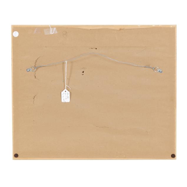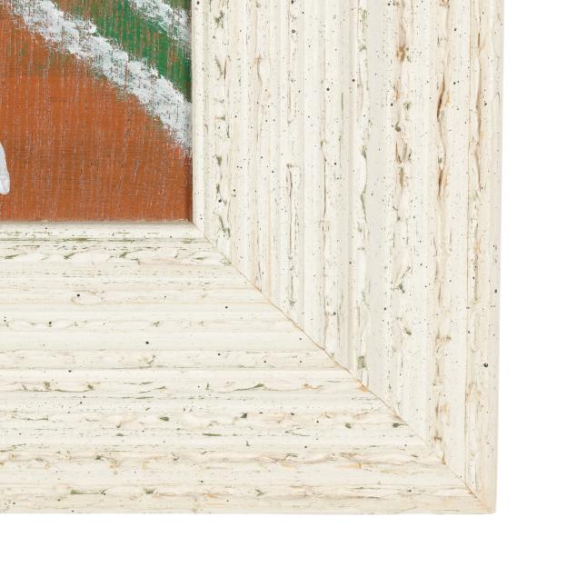 Polychrome paint on board, signed at lower edge, titled to left side, presented in a white painted frame.
