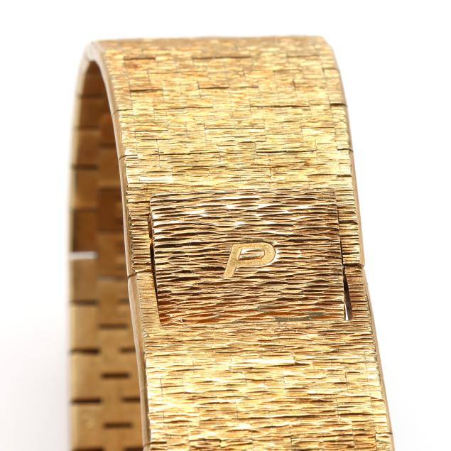 Automatic, Piaget 12P1, reference number 12401A6, serial number 170551, the cushion shaped gold case with faux bois textured bezel, the signed tiger's-eye quartz dial with gold-tone Roman numeral hour markers and gold dauphine hands, the faux bois textured gold mesh integrated bracelet with signed fold over clasp stamped 750, the numbered caseback with Swiss hallmark for 18KT.