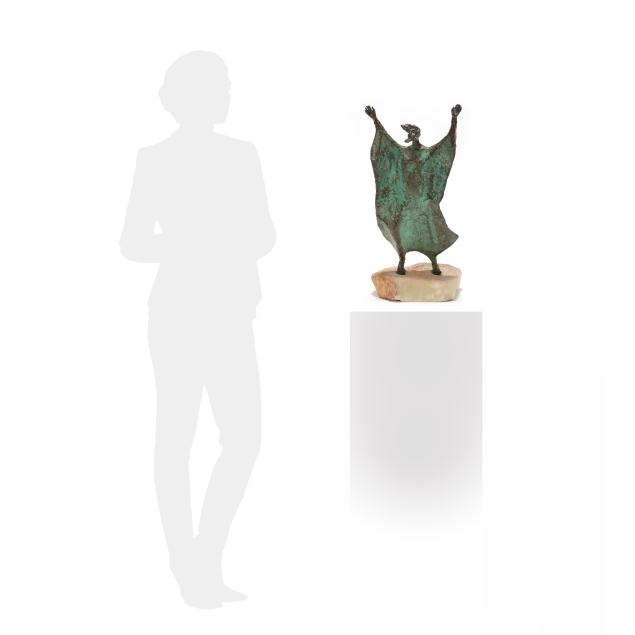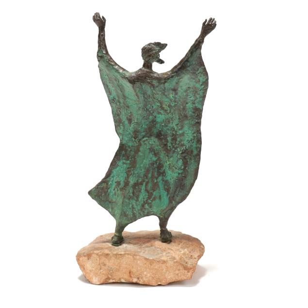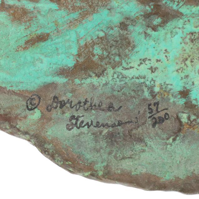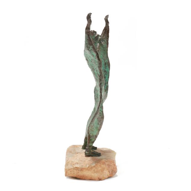 Mid-20th century, bronze with applied verdigris patina, ink signed and edition numbered 57/200 to the reverse, mounted on a natural stone base.