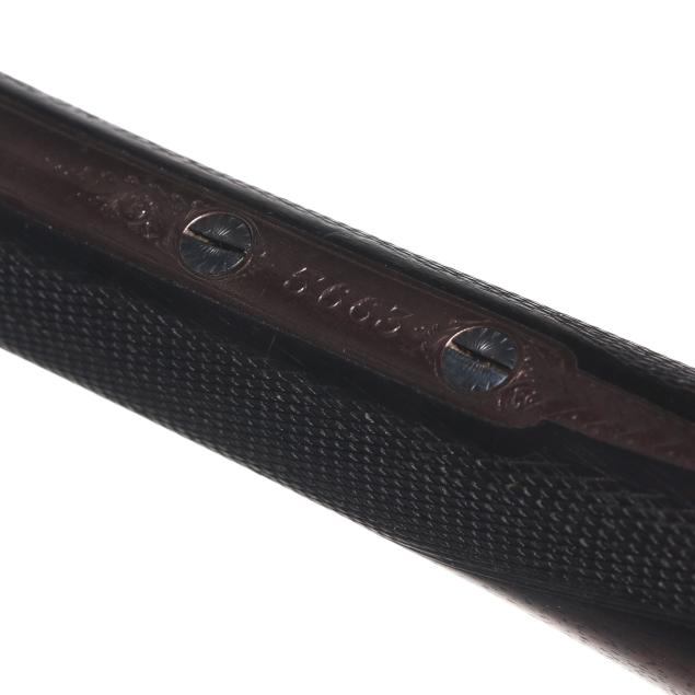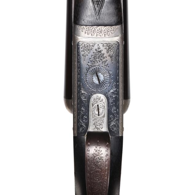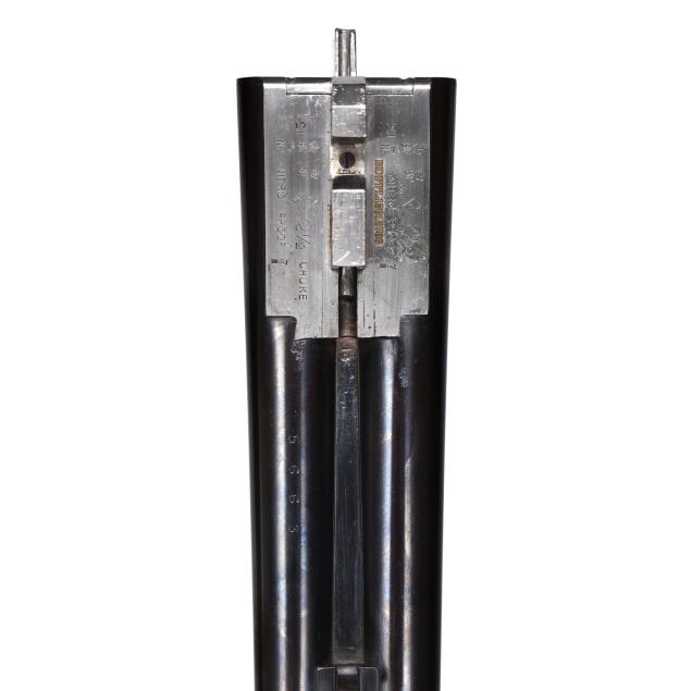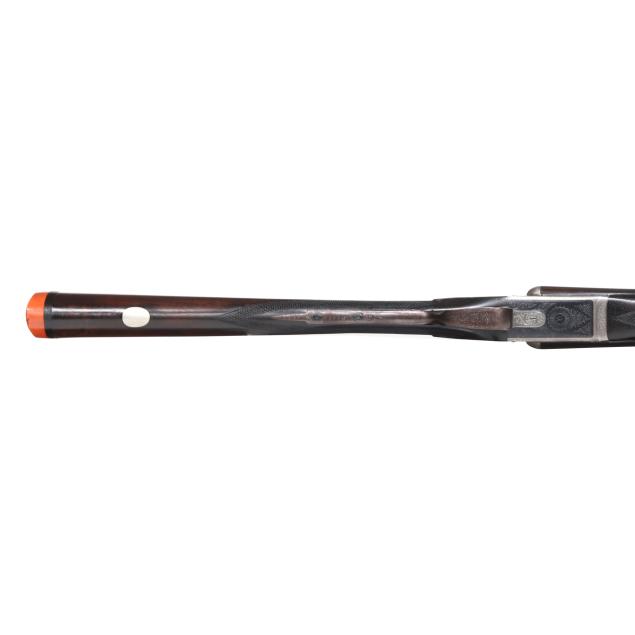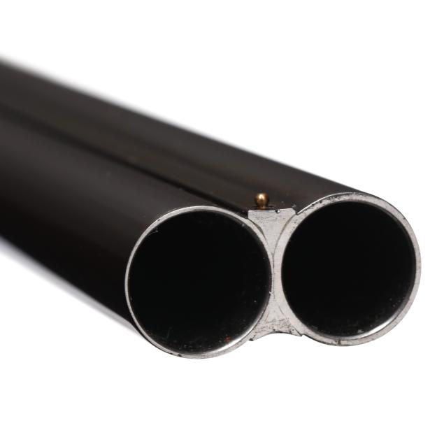 Overall very good estate condition, bores are bright and shiny, barrel rings with a resonant tone, barrel to action fit is strong, barrel bluing sheen is high polish with very rare faint scratches, tiny ding at edge of top rib near maker name and address, engraving remains crisp and articulate, buttstock and forend show typical field marks, right side of forend displays small splinter of wood missing at edge adjacent to barrel, checkering is fine LPI and largely healthy with some edge wear and gentle scattered point damage, recoil pad well fit.