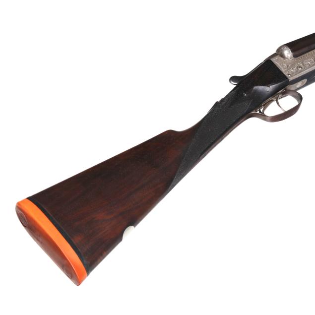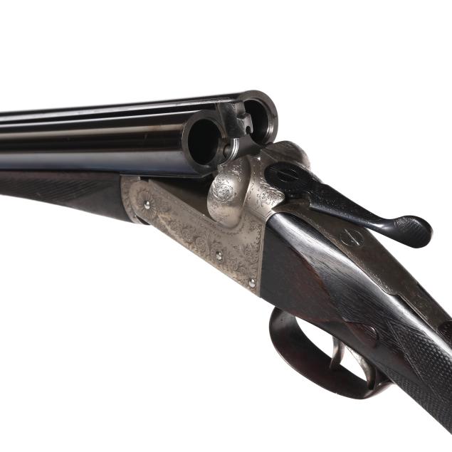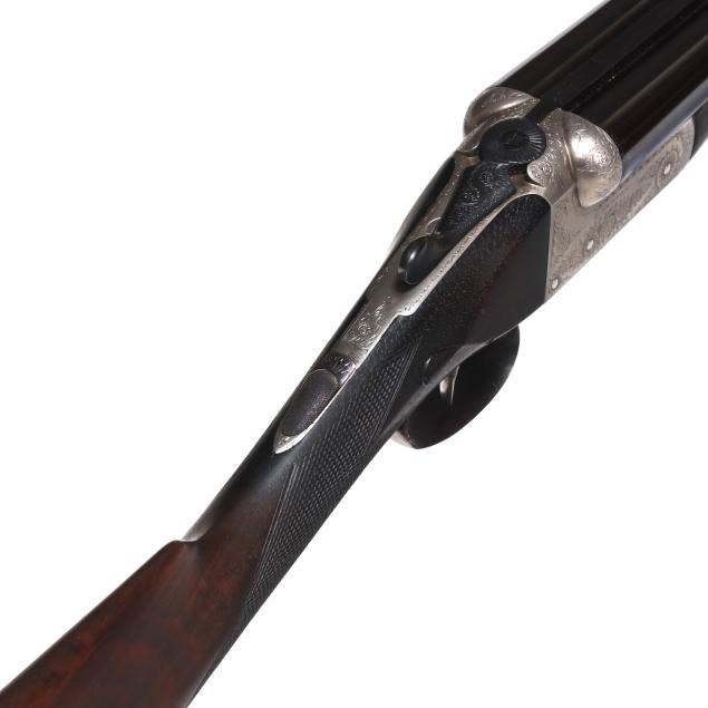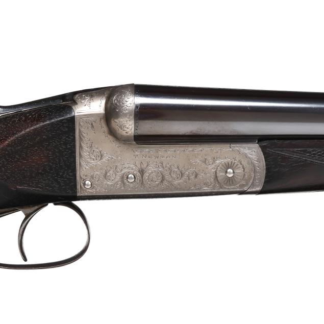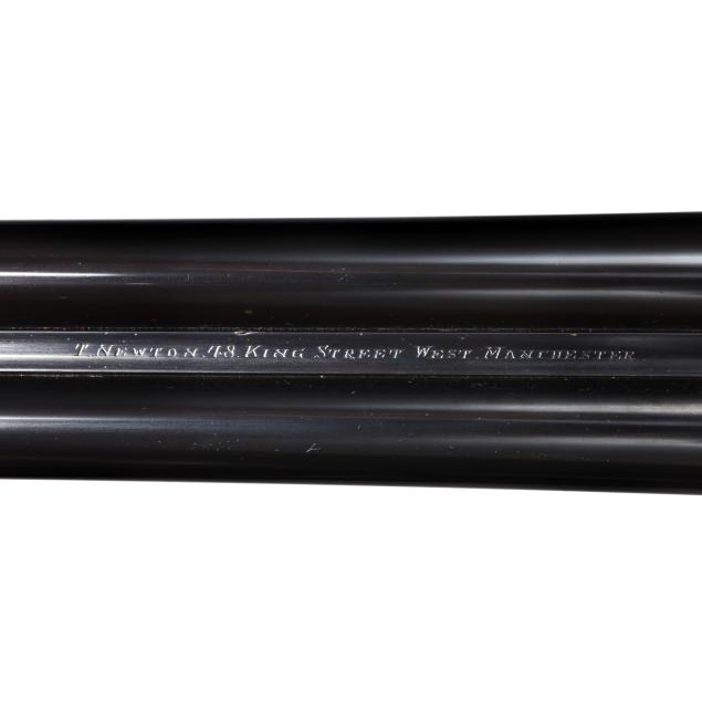 Serial number 5663 present on water table, barrel and trigger guard, text of T. NEWTON present on sides of engraved boxlock action receiver, text of T. NEWTON 48 KING STREET WEST MANCHESTER present on a highly polished blued 27 in. fluid steel barrel, text of 2 1/2" NITRO PROOF present of barrel flats, extractor, double triggers, automatic safety, checkered walnut straight grip buttstock with drop points, checkered walnut splinter forend, aftermarket recoil pad.