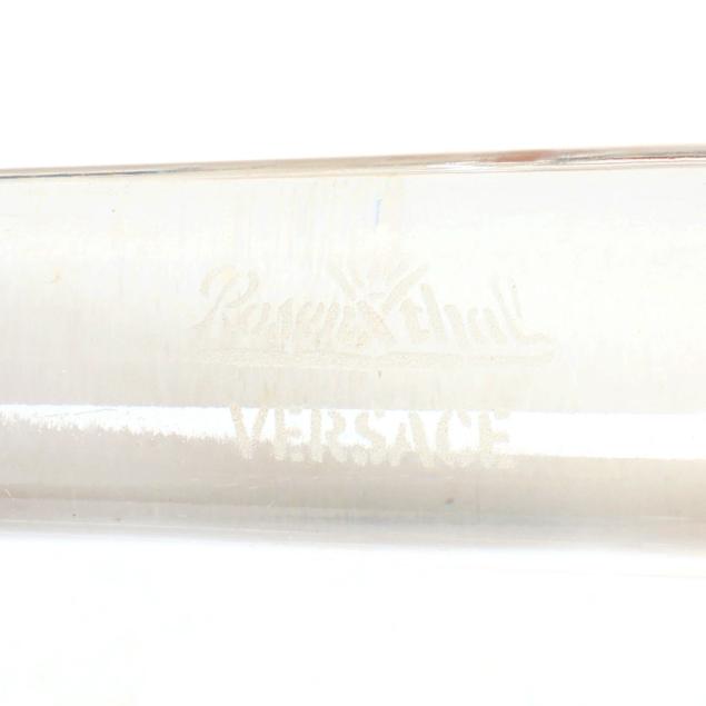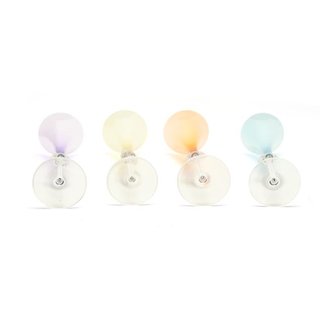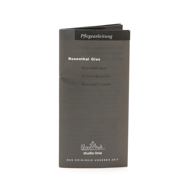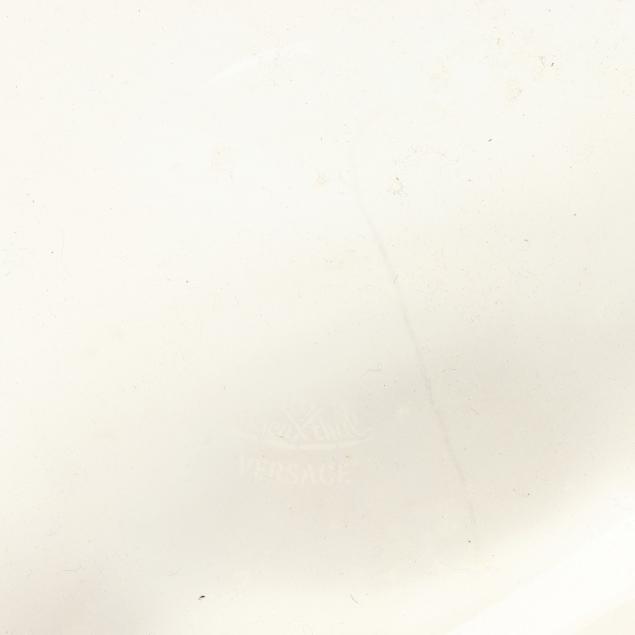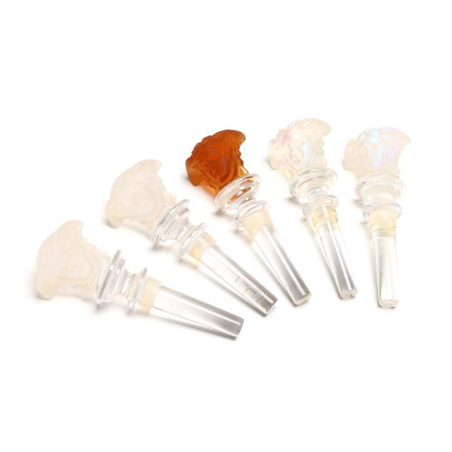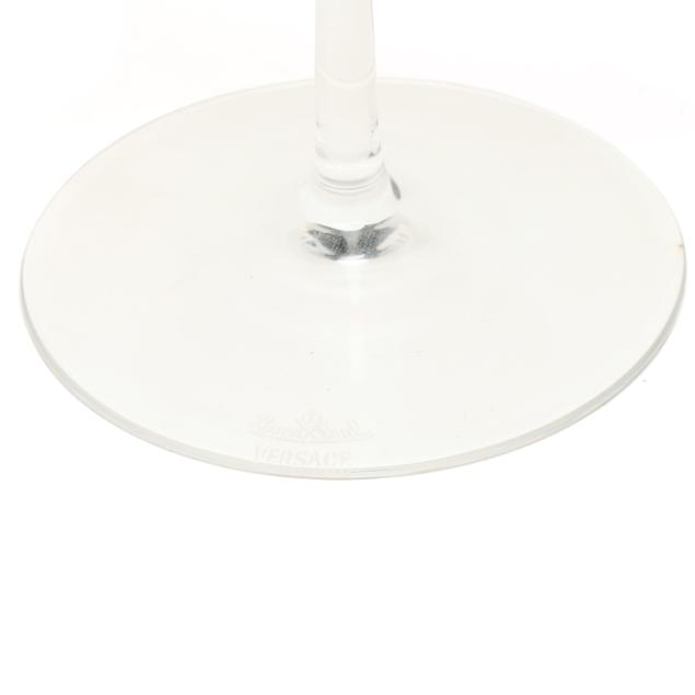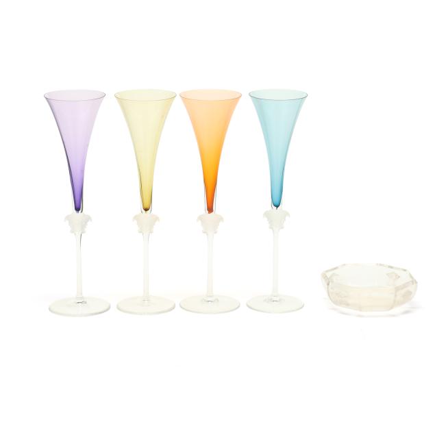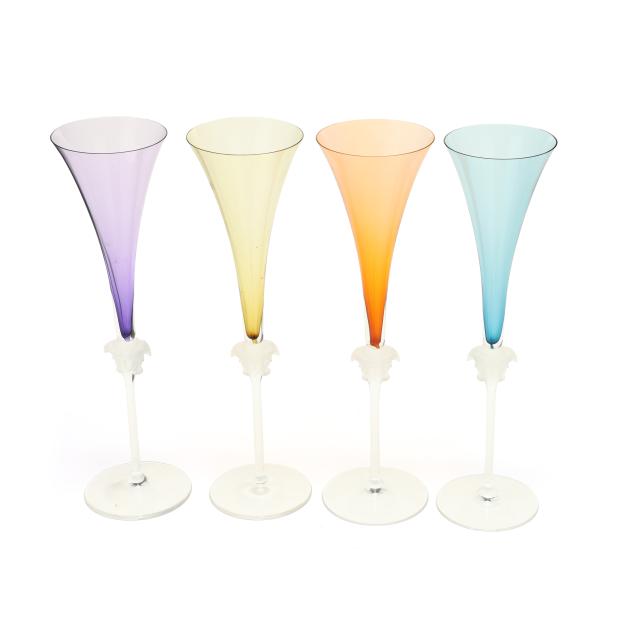(10) pieces, made in Germany, designed by Versace, to include (4) Medusa champagne flutes, each flute featuring a different color bowl including yellow, orange, blue, and violet, all with signature frosted Medusa head stem and marked to the underside, together with original fitted packaging (Flute 12 in.; box 4 1/2 x 5 x 13 1/8 in.); a clear dessert bowl (5 in.); and (5) wine stoppers, including (2) iridescent, (2) frosted, and (1) amber (5 1/4 in.)