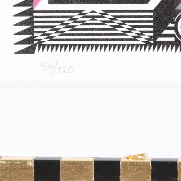 Print in colors in custom Pedro Friedeberg ebonized and gilt-decorated wood frame, artist signed and numbered 56/120 lower margin.