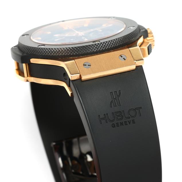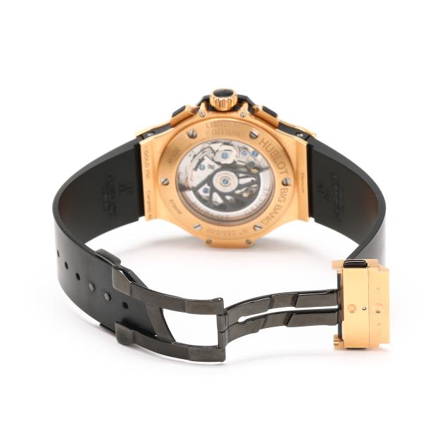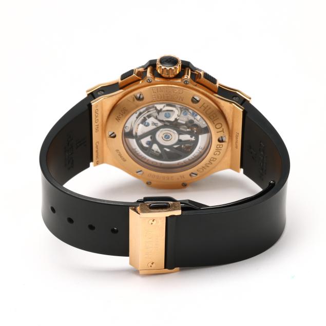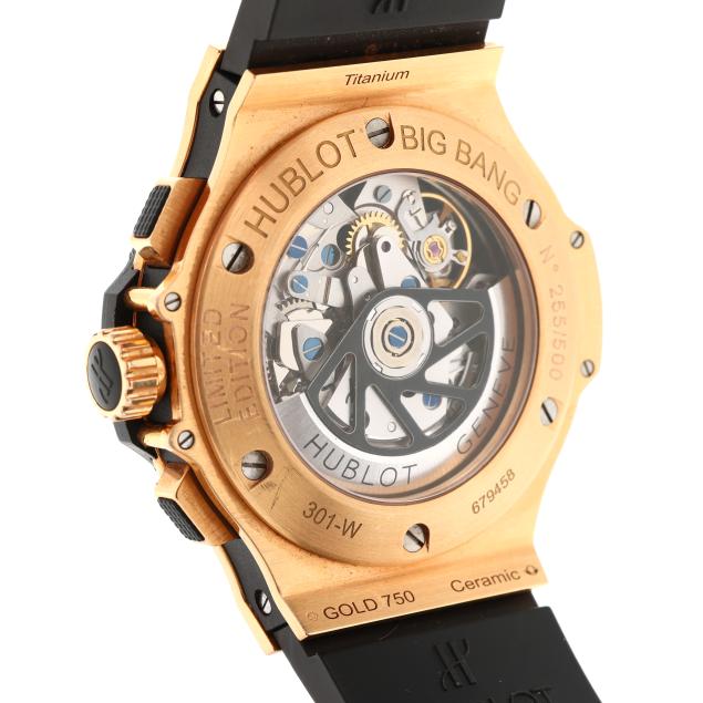 Circa 2009, automatic, reference number 301-W, serial number 679458, limited edition number 255/500, the black titanium case with red gold accents, Kevlar caseband, black ceramic bezel, and signed sapphire crystal, the skeleton dial with rose-tone baton hour markers, rose-tone skeleton hands, subsidiary second dial at 9:00 hour, and subsidiary chronograph dials at 3:00 and 6:00 hours, the signed black rubber strap numbered 12-25-80 / 6-25-100 completed with a black PVD stainless steel and rose gold signed deployant clasp stamped 750, the signed caseback stamped Gold 750 / Ceramic / Titanium, with a Swiss hallmark for 18KT, and numbered 301-W / 679458 / 255/500.