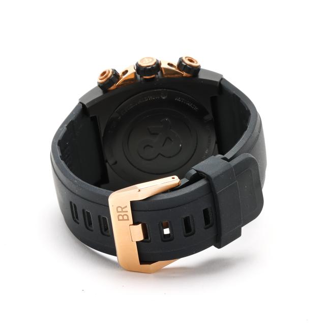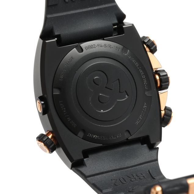 Circa 2008, automatic, reference number BR02-94-S/R, serial number 158, the stainless steel tonneau case with black PVD coating and brushed rose gold bezel and accents, helium release valve, screw down timer crown at 10:00 hour, and screw down pushers and crown, the signed black dial with rose-tone luminescent baton hour markers, luminescent sword hands, rotating outer minute register, subsidiary second dial at 3:00 hour, subsidiary chronograph dial at 9:00 hour, and date window at 4:30 hour, the signed black rubber strap completed by signed rose gold buckle stamped 750 and with Swiss hallmarks for 18KT, the signed caseback stamped St. Steel/Gold 750 and numbered BR02-94-S/R-158.