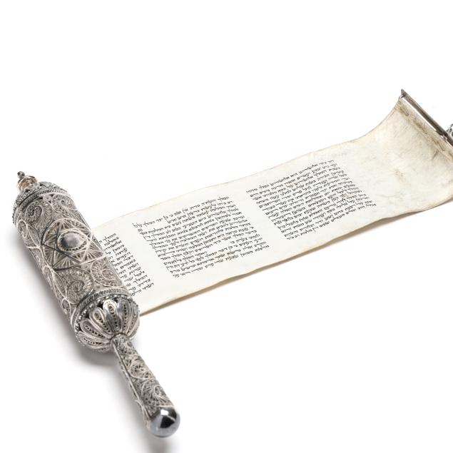 Early 20th century, also called a Megillah, not marked, the central tube overlaid with filigree scrollwork and a Jewish star medallion to the center and topped with an urn form finial, the parchment with script in Hebrew, XRF tests sterling silver content.