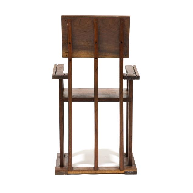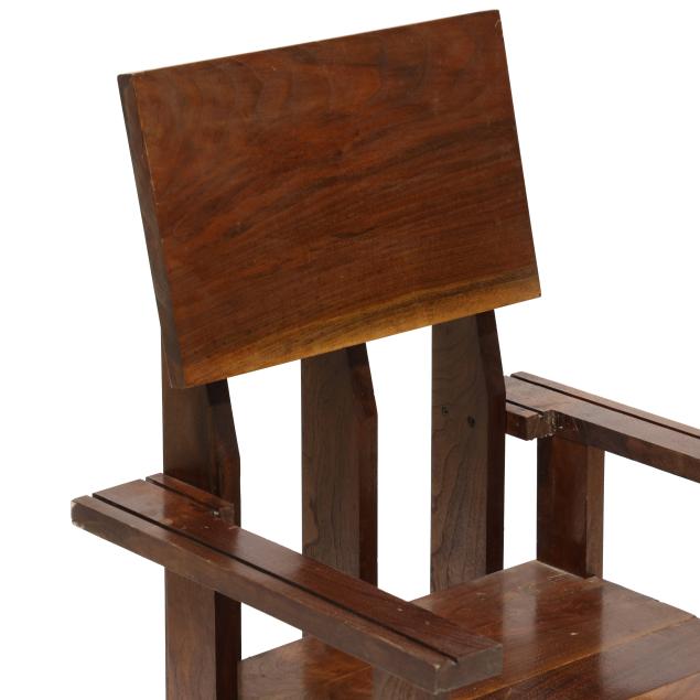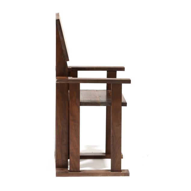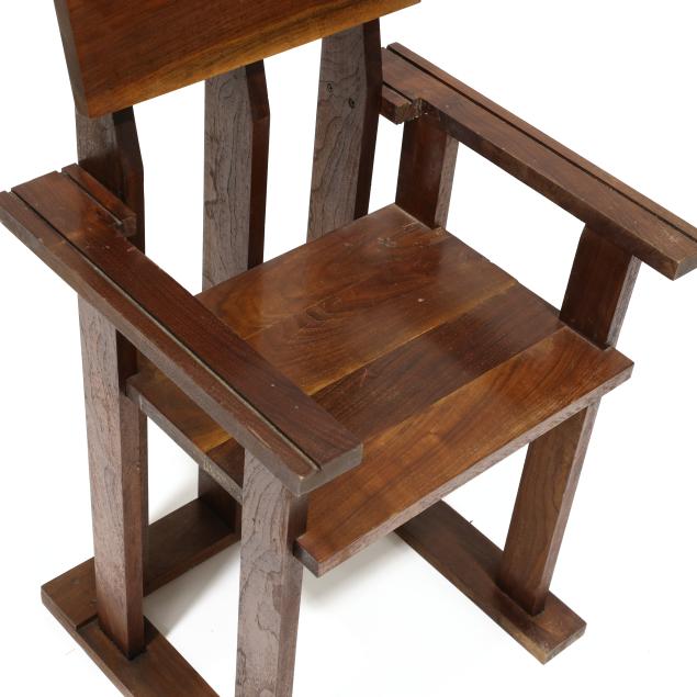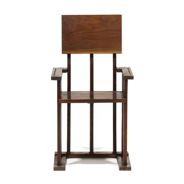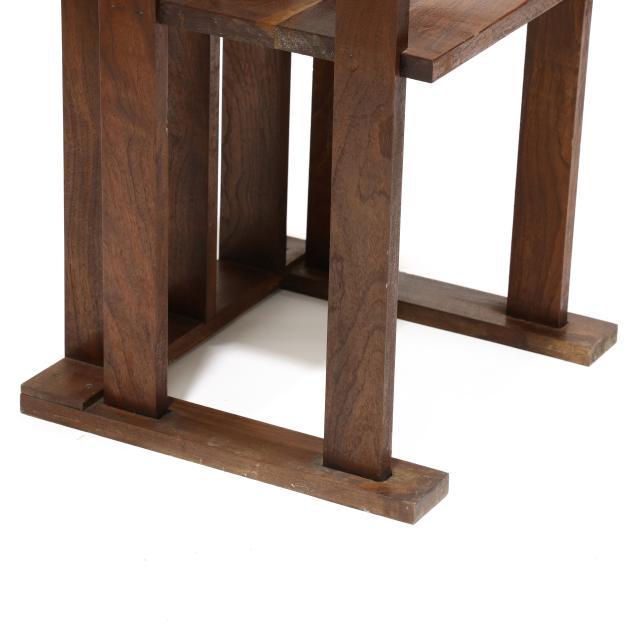 Late 20th century, plank form with angled back, incised arms and flush feet, unmarked.