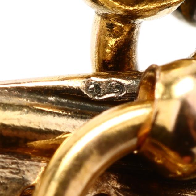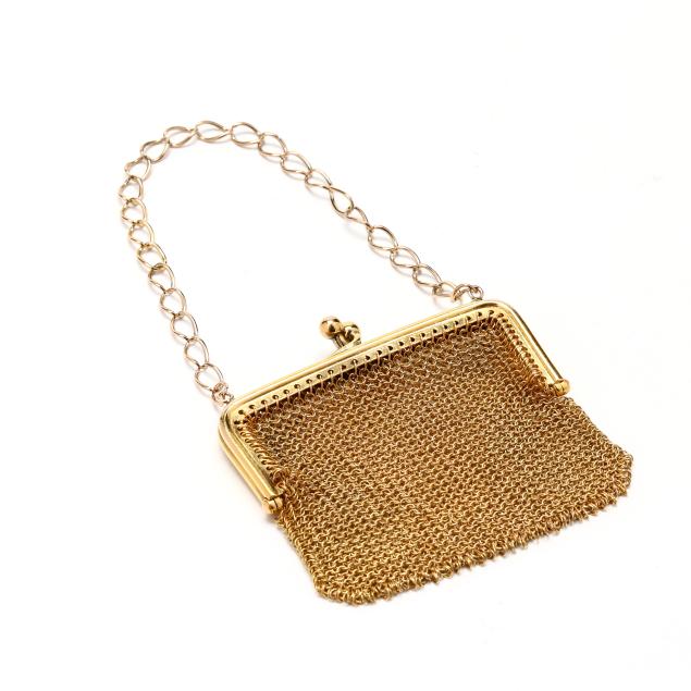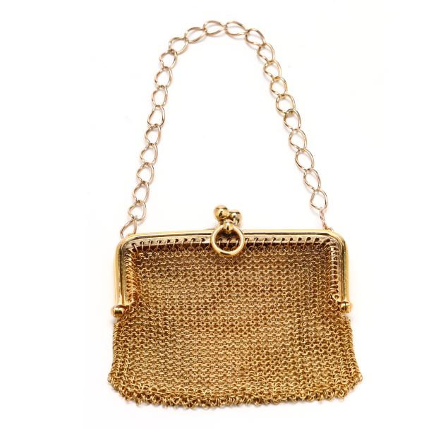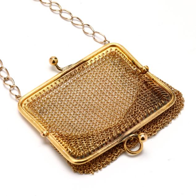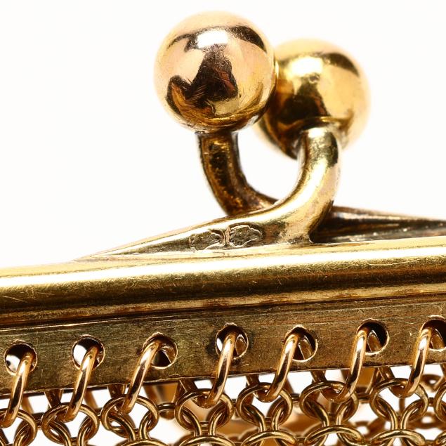 The gold mesh coin purse with snap clasp, jump ring bail, and oval link chain, stamped with French hallmarks for 18KT.