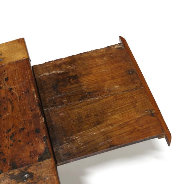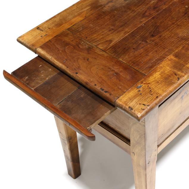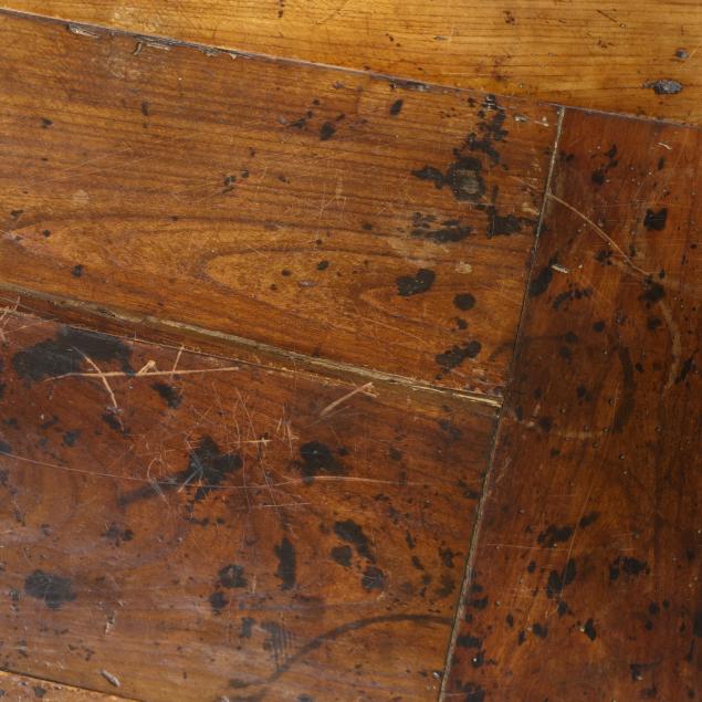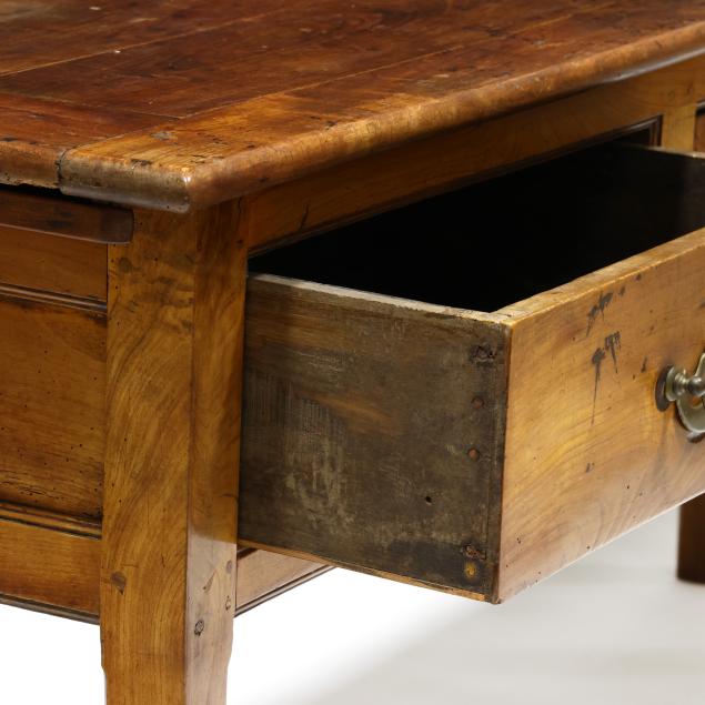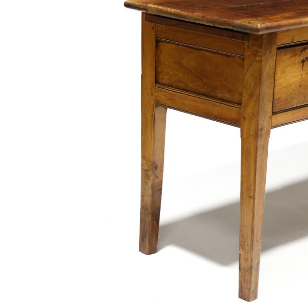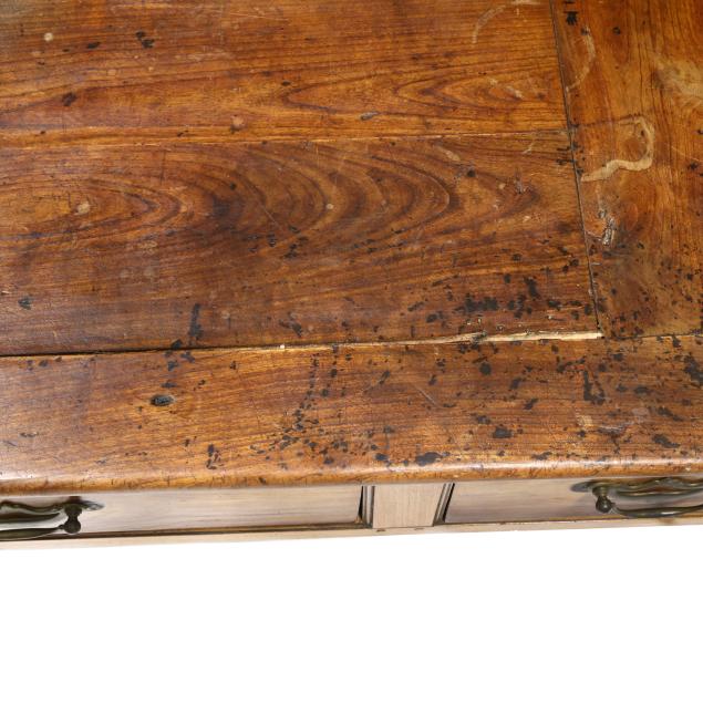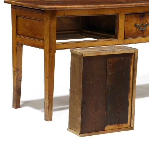 Old insect damage; drawer secondary reworked; all four legs tipped the lower three inches; later pulls (slightly off-set); top with staining and surface wear; the left slide does not open fully.