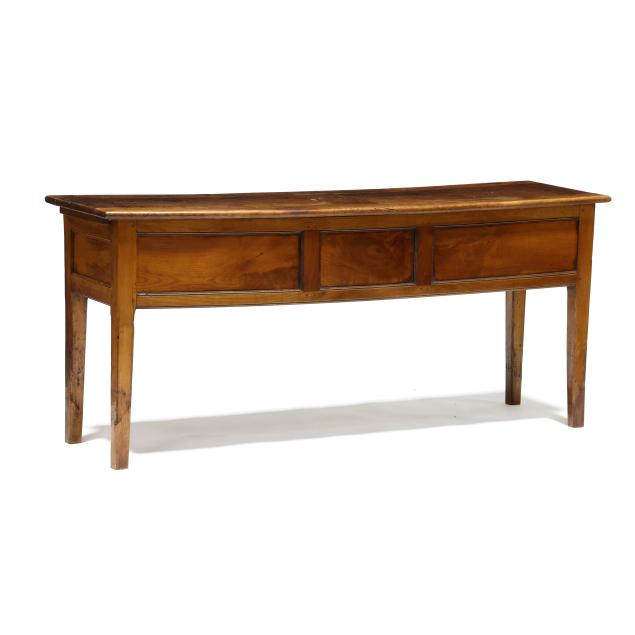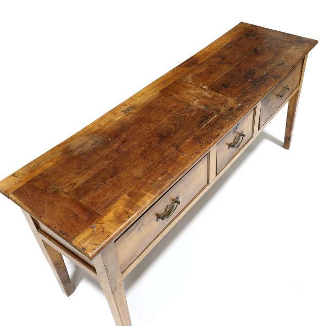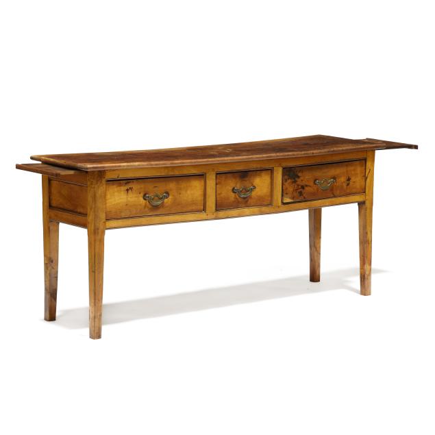 Circa 1800, pine and oak secondary, rectangular flush paneled top with pull-out slides to both ends, three flush drawers, paneled sides, straight tapered legs.