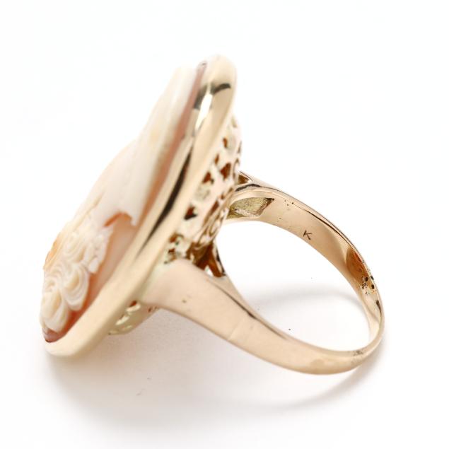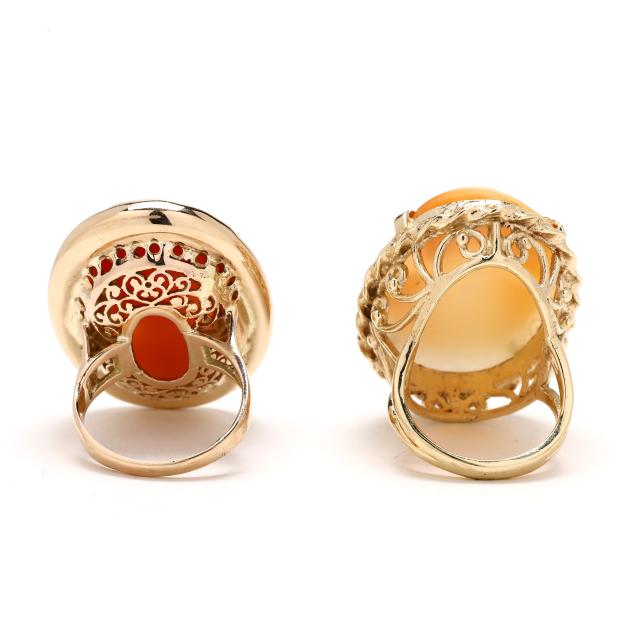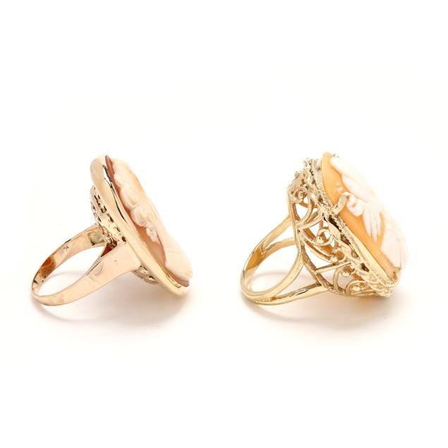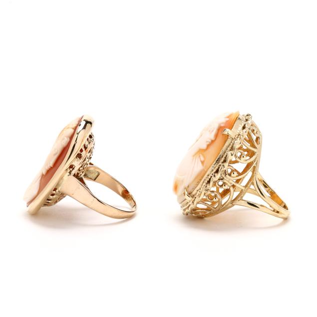 To include: one centered on a carved shell cameo depicting a classical woman in profile, with openwork scrolled detailing to gallery, completed with a split shank, testing 14KT (31.5 x 24.5mm; ring size 6); and one centered on a carved shell cameo depicting the profile of a woman wearing a beaded necklace within a gold surround and with openwork scrolled design to gallery, completed with a cathedral shank stamped K, testing 14KT (31 x 24.5mm; ring size 6.5).