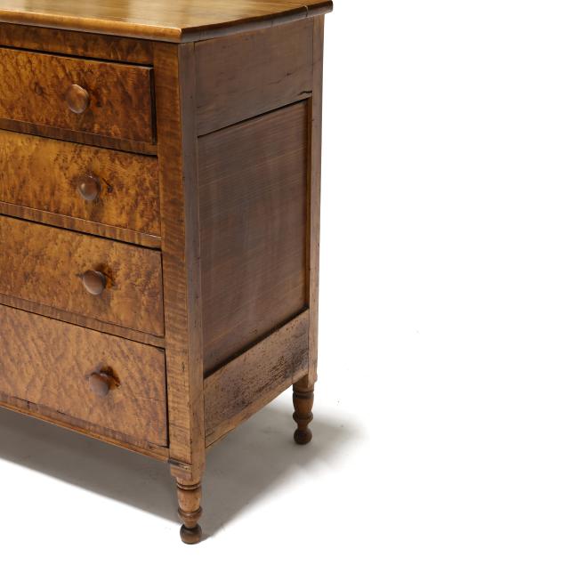 Circa 1830, maple, maple veneer, poplar and white pine secondary, rectangular top with rounded edge, four flush graduated drawers in bird's-eye-maple with tiger-maple stile surrounds, paneled sides, turned feet.